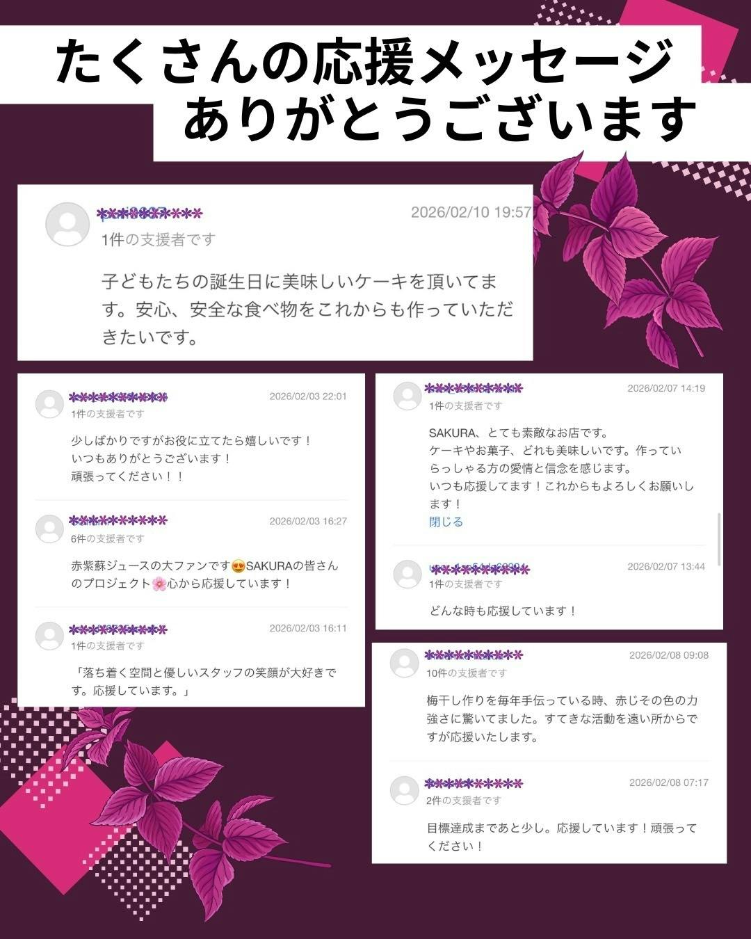 2026/02/21 15:35こんにちは福島県いわき市にございます厳選素材の洋菓子店SAKURAです!先日皆さまからのご支援額がありがたいことに目標としていた100%に到達し、SAKURAでは150%という目標を新たに目指すことになりました。そんな中、皆さまから心あたたまる応援メッセージをたくさんいただいております。本当にありがとうございます。SAKURAのオーナーをはじめ、スタッフ一同、とてもパワーをいただいております!クラウドファンディング締め切りの3月15日まであともう少し、皆さまからの心あたたまるメッセージと共に目標達成のため頑張ってまいりますので引き続きよろしくお願い申し上げます。 もっと見る