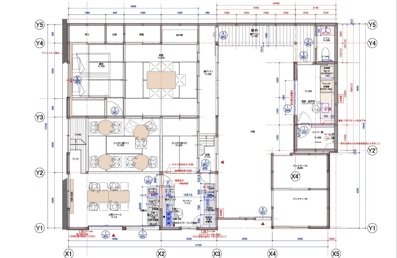 かつて駄菓子屋スペースだったのは図面左下の土間でした。そこを中心に、飲食店営業許可をもつスペースとし、奥は宿泊時に使用する寝室にします。この母屋のほうは大きく間取りを変更することなく、傷んだところをきれいに修繕し、快適な古民家暮らしを味わっていただけるようにします。
