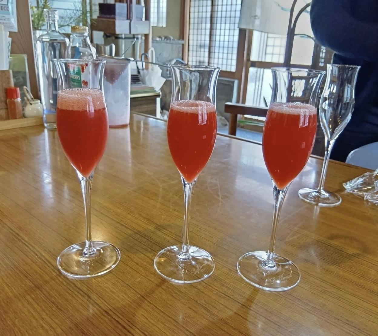 今日は、お料理の前にお客様にお出しするウェルカムドリンクの試飲をさせていただきました。