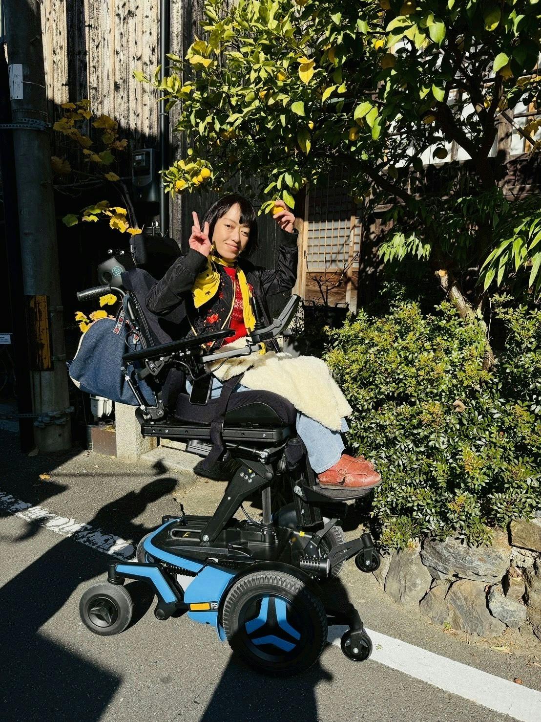 普段は、普通の車いすに乗った方でもこの車いすを使用することで高い木の実にも手を伸ばすことが可能ですし、尚且つ電動車いすなので自分で操作も可能です。