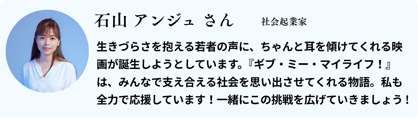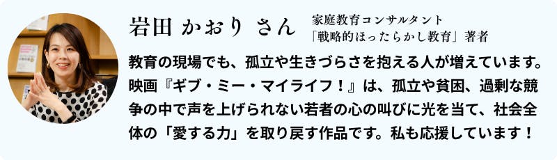 映画『ギブ・ミー・マイライフ!』は、単なるエンターテインメントではありません。孤立する子どもたちの声を社会に届け、無関心を関心に変え、共感から行動への連鎖を生み出すことを目指しています。