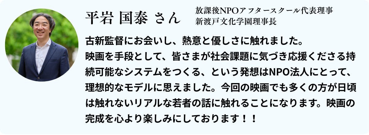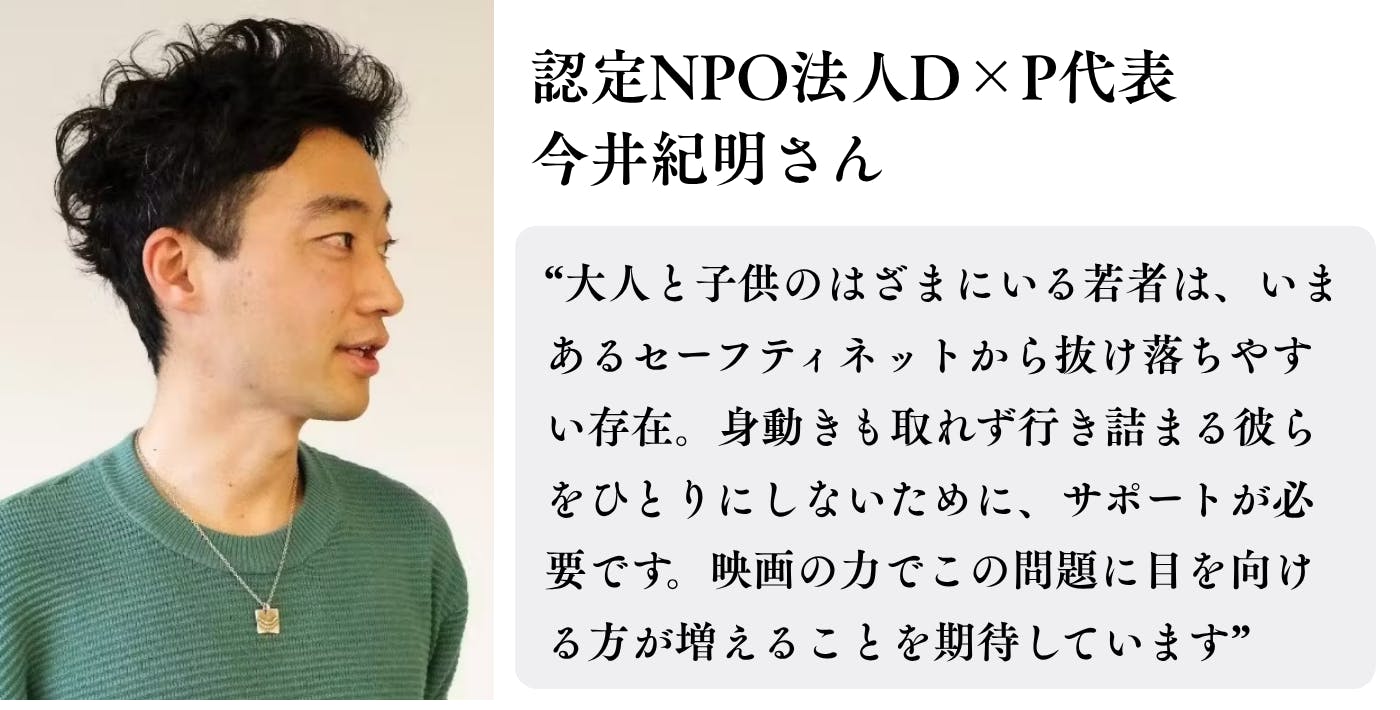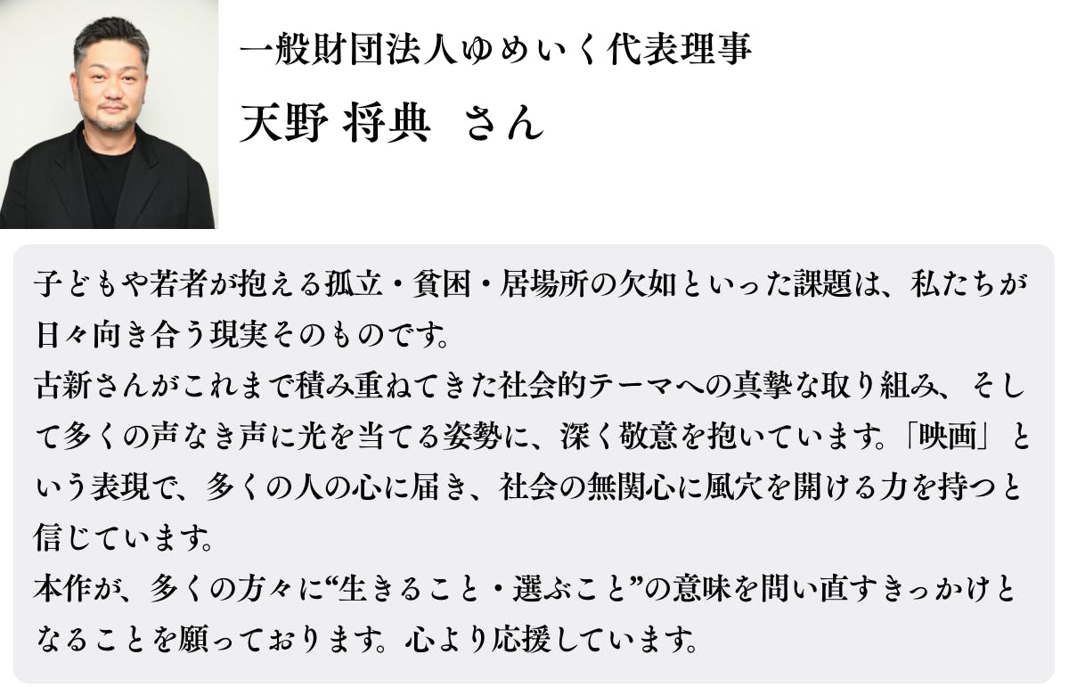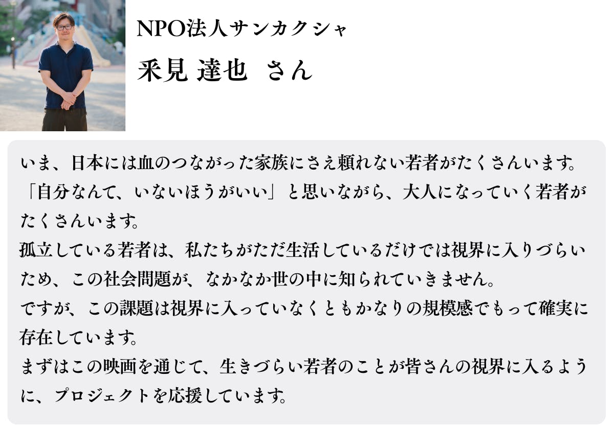 この映画は多くの方の共感の力によって製作され、様々な背景で社会から孤立する若者と彼らを取り巻く大人たちを描くことにより、この喫緊の課題が広く社会に認知されることを目指します。さらに、映画の配給・配信によって出た利益は関連支援団体への寄付を予定しています。