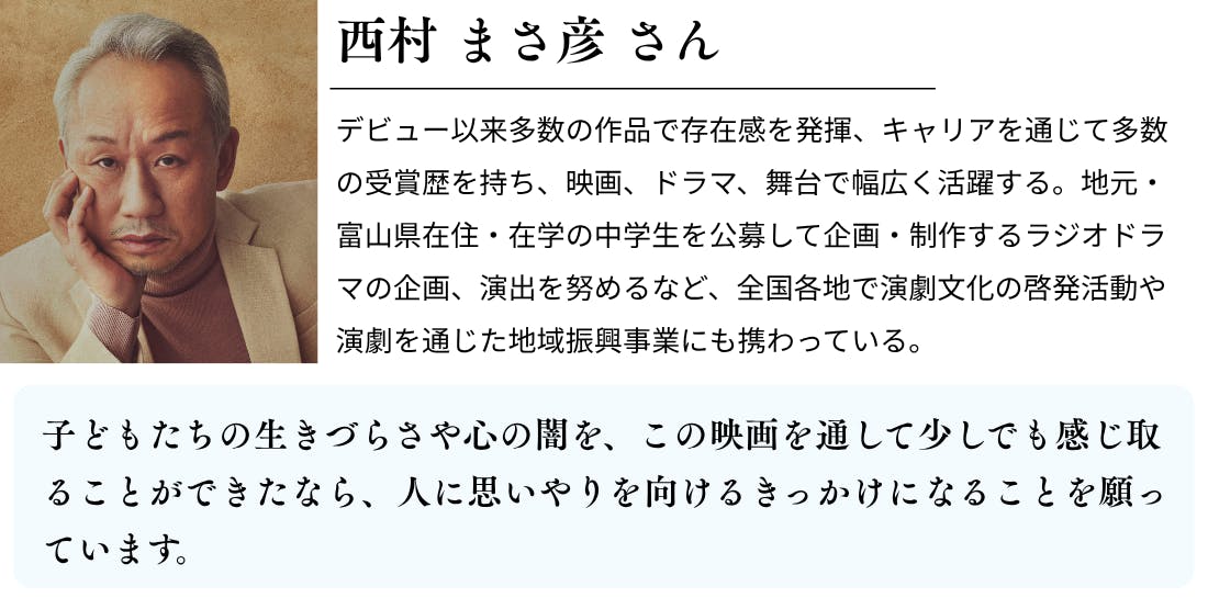 この映画を通じて、大人たちが、自分のあり方を見つめ直すきっかけになればと思っています。