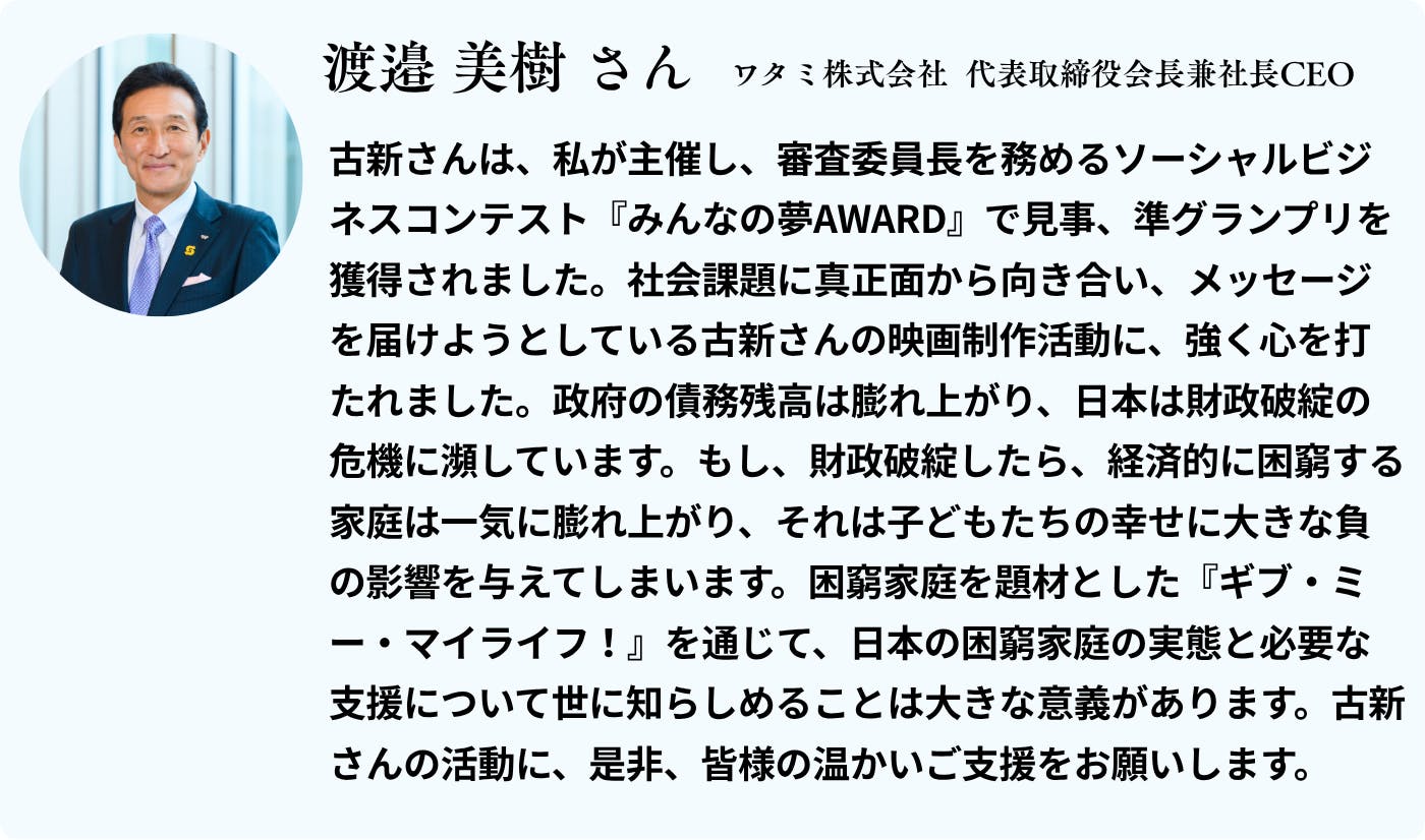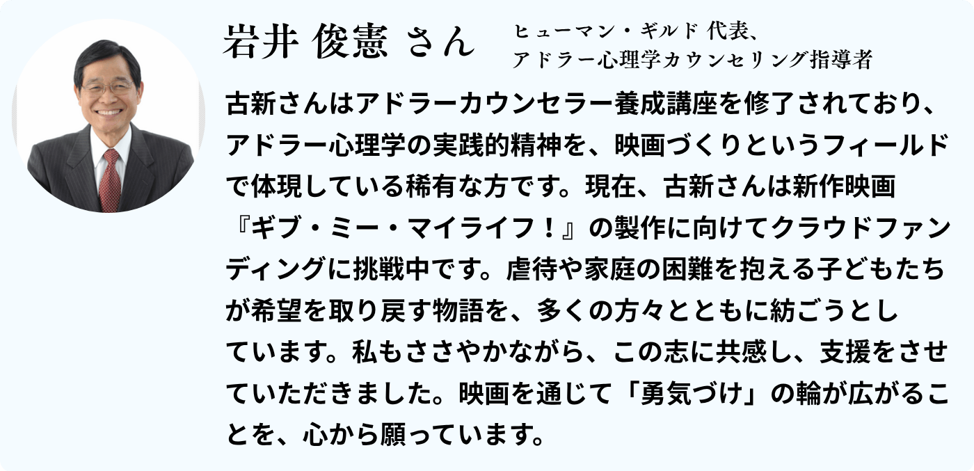 2025/12/24 09:34映画「ギブ・ミー・マイライフ!」クラウドファンディングプロジェクト、いよいよ残り1日となりました。第一目標であった支援額1,000万円を突破し、現在はNextゴールは支援者500人を目指したラストスパートです!これまでにご支援いただいた方々から、たくさんの温かい応援メッセージが届いております。ほんの一部ですが、ご紹介したいと思います。”応援しています!素晴らしい古新作品にあるYesAndの精神で子供たちも大人たちも皆が生きる希望を絶やさずいられる映画を今回も期待しています!!”(funadaruma様)”若者の心に光を灯すこの挑戦に、心からのエールを送ります。 映画が、希望と優しさの輪を広げますように”(Sachiyo Mitsuhashi様)”わたしは未熟児で生まれて、両目は未熟児網膜症による弱視です。両手と両足には脳性まひの障害があります。わたしは体を使うボランティアはでけへんけど、応援することはできます。少しでもお役に立てるとうれしいです。『子どもたちが安心して、笑顔ですごすことができますように』て思っています。これからも応援していますね”(Maatan36様)”子どもたちの未来のために、この素敵な映画がたくさんの方に届くことを願っています。”(nanakamado2020様)”社会から孤立する子ども達が想像以上に多くいること、その現状をより多くの人に知ってもらえますように。この映画の社会的意義はとても大きいと思います。映画が多くの人に届きますように!応援しています。”(guest929163314aa4様)”作品内容に大変注目をもちました。子供たちを取り巻く環境をうまくとらえ、映画作品として創り上げていただけることに期待しています。頑張ってください!”(Rooting for the Challenge_YASU様)”古新監督、この映画は、多くの子供たちが幸せに笑顔で生きていくことのできる未来をつくっていくための大きなメッセージを与えてくれることと思います。心から応援しています!同志です!”(Harumi Nakajima様)”私は子どもが好きで、子どもを望んでいましたが、叶えることが出来ませんでした。ただ…独身の為そして、収入が少ない為、今の日本では、養子縁組も里親になるのも難しいです。日々ニュースで子供の虐待死や産まれた子供を死なせるものを見るたび、どんなに私が育てたい…と心苦しみます。少しでもお力になれるのなら!ステキな作品を完成させて下さい!そして、たくさんの方々にこの作品が届くことを願い応援しています!頑張ってください!”(KAICHURACING YARINO様)”不登校や児童養護施設の支援をしていますが今の社会課題の根っこは全て繋がっていると思います。その部分に切り込んで社会に発信してくれる古新さんの作品にとても期待していますし応援しています!頑張ってください!”(user_b4c766f9f7b4様)”全ての若者が健やかに暮らし一人一人の力を生かしていけるよう、子供の貧困や若者の孤立という社会課題がこの映画をきっかけに少しでも社会に理解され支援が広がることを願っております。応援してます!”(cocococo123様)”現代の子供たちの健やかな成長を、社会全体でどう支えていけるのかを考える大切なきっかけになると感じています。公開を心から楽しみにしています。”(user_176baee80cc4様)”私も教育関係の仕事に携わっています。 今回のプロジェクトが成功して、問題点が多くの方に伝わることを願っています。 頑張ってください!”(user_63a6ad0caea4様)”自分の人生を自分で選んでいける 子どもたちが抑圧されない環境を、大人がつくっていく責任があることに改めて気づかされました。 応援しています。”(user_8a120b1999d4様)ここにご紹介できなかったものも含め、本当にたくさんのメッセージ、ありがとうございます!残りわずかとなりましたが、皆様の応援を胸に、最後まで走り切りたいと思います! もっと見る
