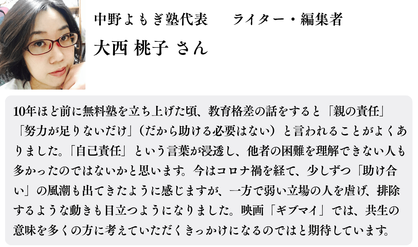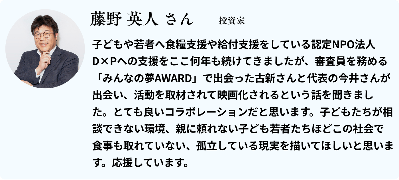 この映画を通して、大人の心を動かし、子どもたちの未来を切り拓くこと。そして、映画を観た一人ひとりの大人が、自分の周りの現実に目を向け、行動を変えるきっかけになることを願っています。