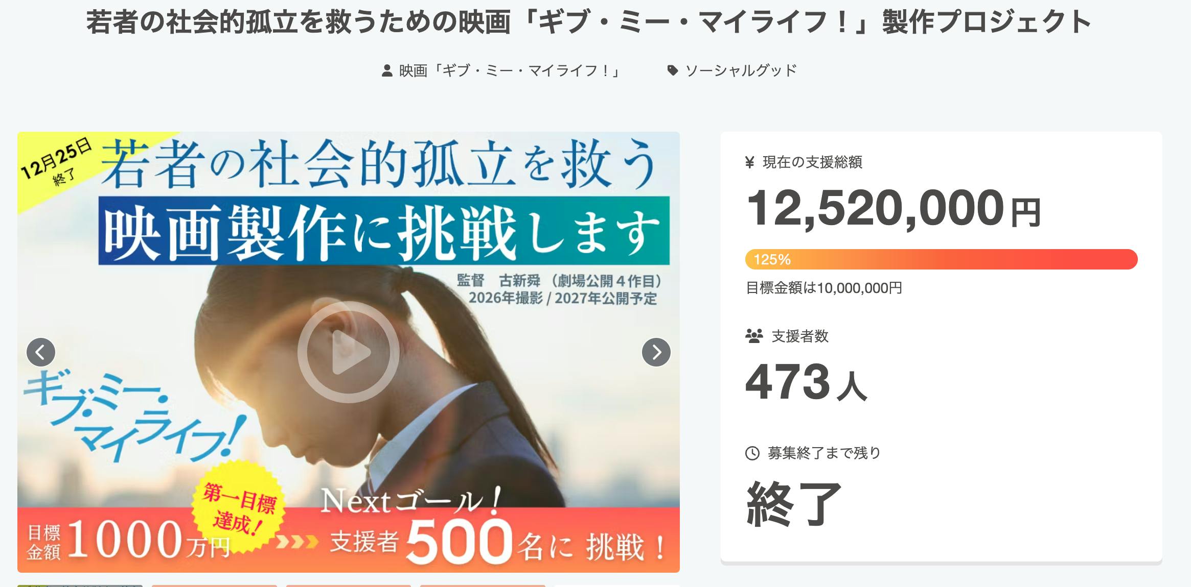 2025/12/26 18:27皆さん、こんばんは。監督の古新です。この度は、本クラウドファンディングに温かい応援を寄せていただきましたこと、厚く感謝申し上げます。この数週間、全国各地の沢山の方から、温かい言葉をいただきました。「この映画は、今の社会に本当に必要だと思う」「若い人たちが、もっと安心して弱音や本音を吐ける場所があればいい」「信頼できる大人とつながれる関係が、もっと増えたらいい」他にも大変多くのご期待や応援を賜り、そんな温かい声が、このプロジェクトを前に進めてくれました。映画『ギブ・ミー・マイライフ!』のクラウドファンディングは、昨日、無事に終了しましたが……・ご支援総額 12,520,000円・支援者 473名・目標1,000万円に対して 125%の達成となりました!!まず何より、この挑戦に関わってくださったすべての方に、心から感謝いたします。 ご支援くださった473名の皆さんはもちろん、シェアしてくれた方、投稿を読んで気にかけてくれた方、コメントやDMで背中を押してくれた方、「応援しているよ」と声をかけてくれた方。お一人おひとりの行動が、この結果につながりました!このプロジェクトは、映画製作者のものではなく、多くの支援者様・応援者様とで育てている共創の映画です。この映画は、孤立する若者が一人で困難を抱え込むのではなく、弱さを言葉にし、信頼できる誰かと関係を結び直していく物語でもあります。そして、このプロジェクトはここで終わりません。来年には、いよいよこの物語をスクリーンに託す主演俳優の発表もできそうです。映画は、これから本格的に動き出します。また、「クラファンに間に合わなかったけれど、応援したい」という声を大変多数いただいています。現在、追加のご支援窓口を準備中です。整い次第、改めてご案内させてください。今回のクラウドファンディングはゴールではなく、この映画が社会に向かって進むための大切なひとつの節目でした。 まだまだ、私たちの挑戦は道半ばです。ここから、脚本制作、キャスティング、撮影、編集、そして公開へ。この物語は、皆さんと一緒に育ち続けていきます。ここから先も、どうか見守り、関わり続けていただけたら嬉しいです。海外も含めた全国各地からの温かい応援に深く感謝いたします 。映画『ギブ・ミー・マイライフ!』 監督・古新 舜&スタッフ一同 もっと見る