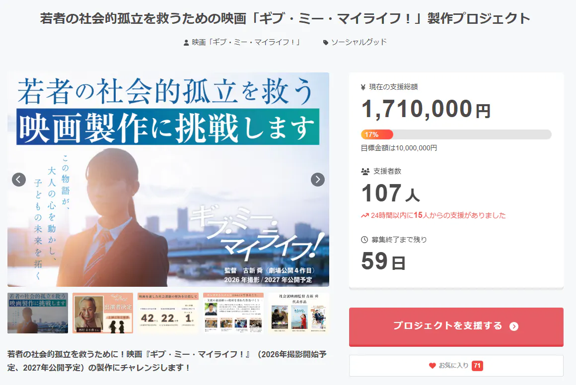 映画「ギブ・ミー・マイライフ!」のクラウドファンディングプロジェクト、開始1週間で100名を超える方々にご支援をいただきました!