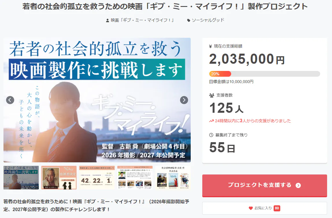 映画「ギブ・ミー・マイライフ!」のクラウドファンディングプロジェクトがスタートして10日目。早くも、支援総額200万円を突破いたしました!!!