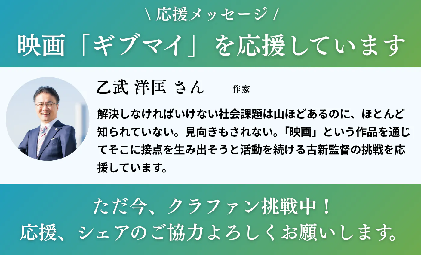 映画「ギブ・ミー・マイライフ!」クラウドファンディングプロジェクトに、作家の乙武洋匡さんから応援メッセージをいただきました。