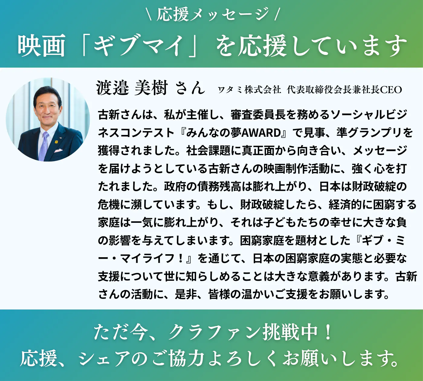 映画「ギブ・ミー・マイライフ!」プロジェクトに、ワタミ創業者で代表取締役会長兼社長CEOの渡邉美樹さんから応援メッセージをいただきました。