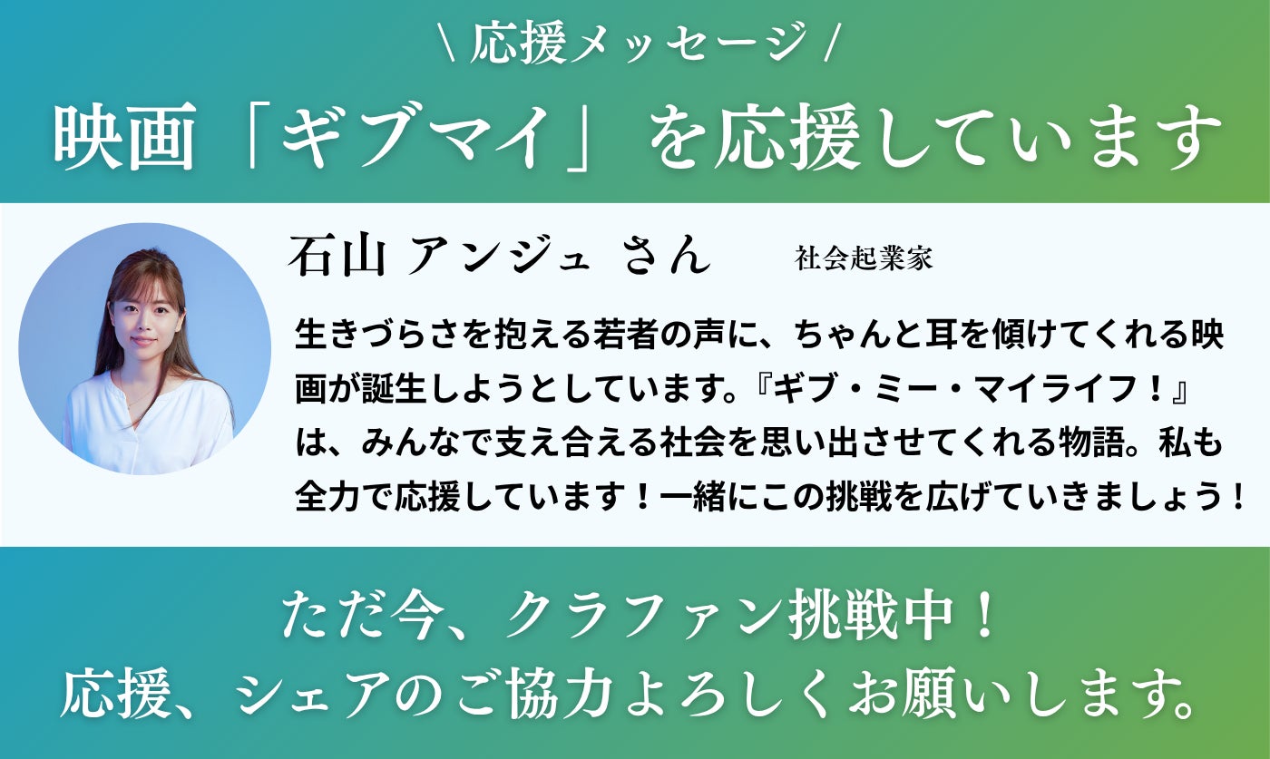 映画「ギブ・ミー・マイライフ!」プロジェクトに、石山アンジュさんから応援メッセージが届きました。