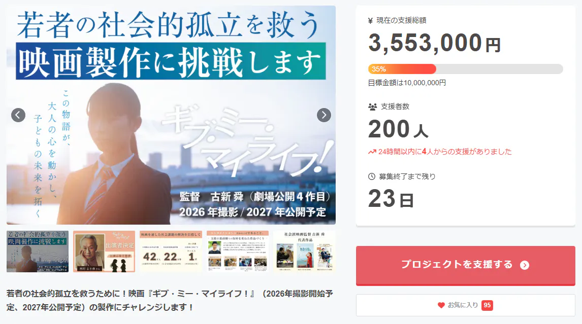 映画「ギブ・ミー・マイライフ!」クラウドファンディングプロジェクトへの支援者が200人を突破しました。多くの方に応援に勢いをいただいております。