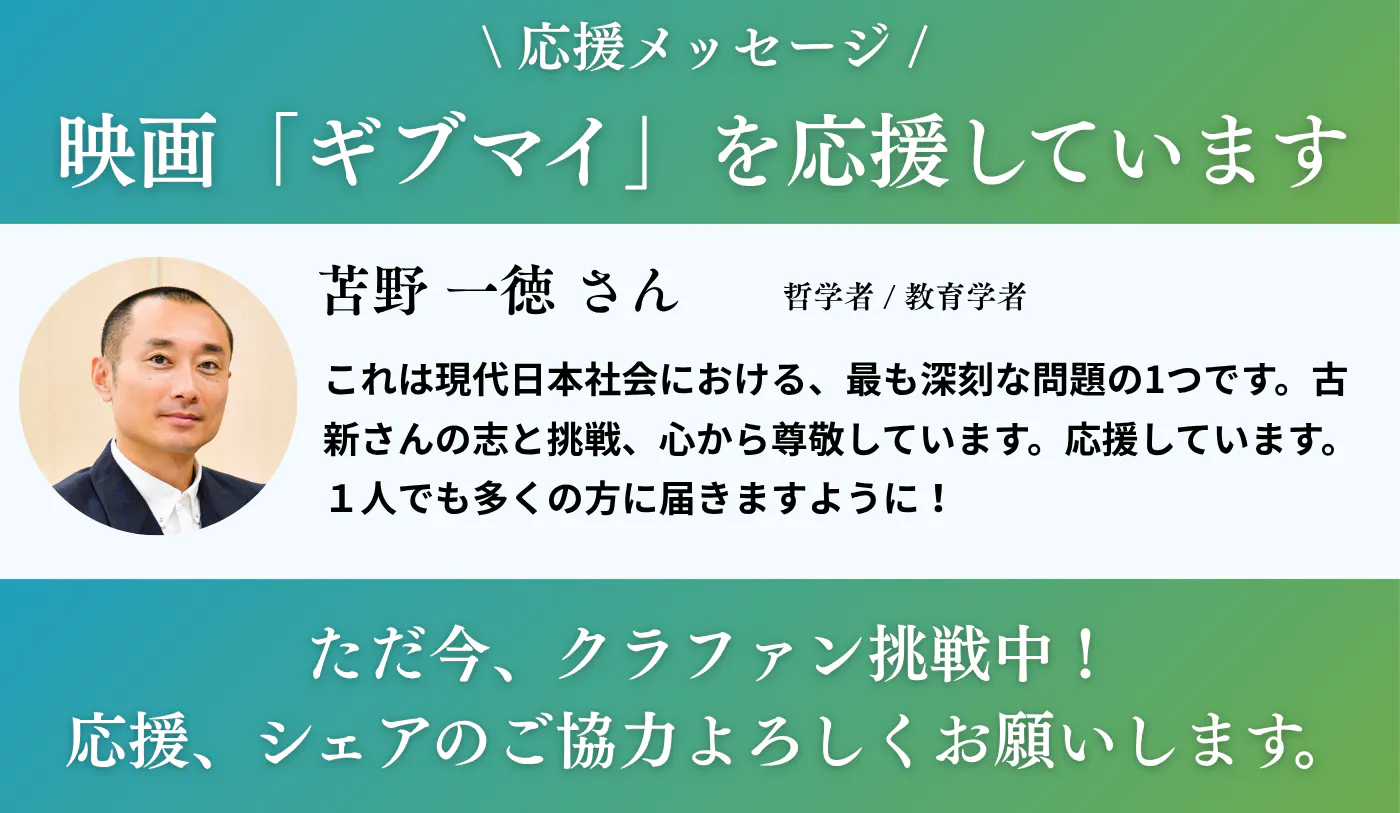 映画「ギブ・ミー・マイライフ!」プロジェクトに、哲学者で教育学者の苫野一徳さんから応援メッセージをいただきました。