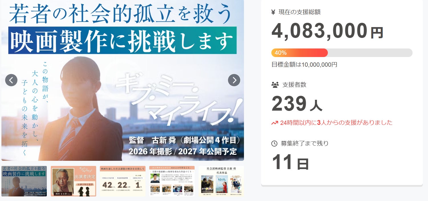 映画「ギブ・ミー・マイライフ!」クラウドファンディングプロジェクト、終了まで残り11日で支援総額が400万円を超えました!