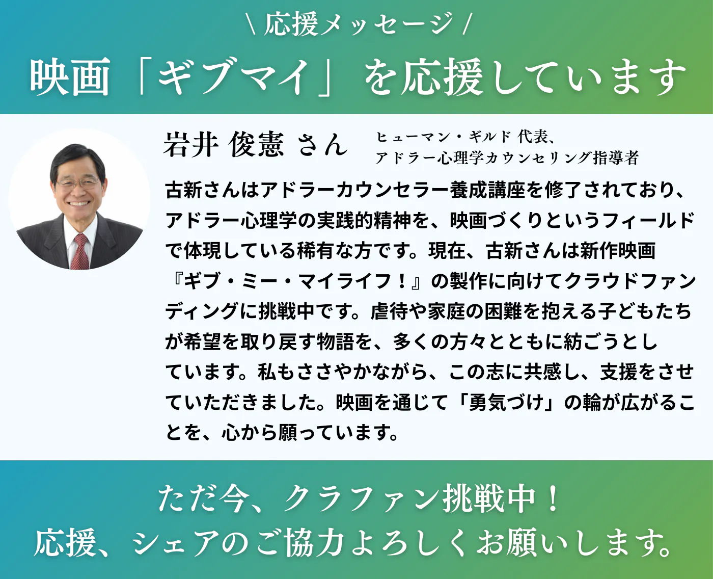 映画「ギブ・ミー・マイライフ!」プロジェクトにアドラー心理学カウンセリング指導者の岩井俊憲さんから応援メッセージが届きました。