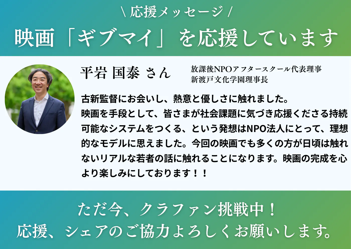 学校法人新渡戸文化学園理事長であり、放課後NPOアフタースクール代表である平岩国泰さんが映画「ギブ・ミー・マイライフ!」プロジェクトに応援メッセ―ジを寄せてくださいました。