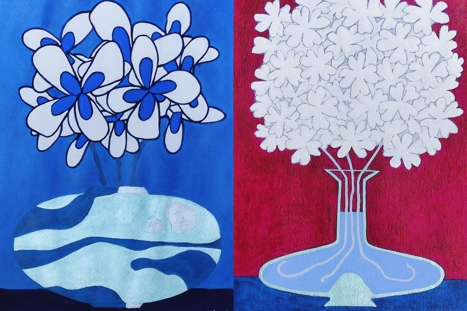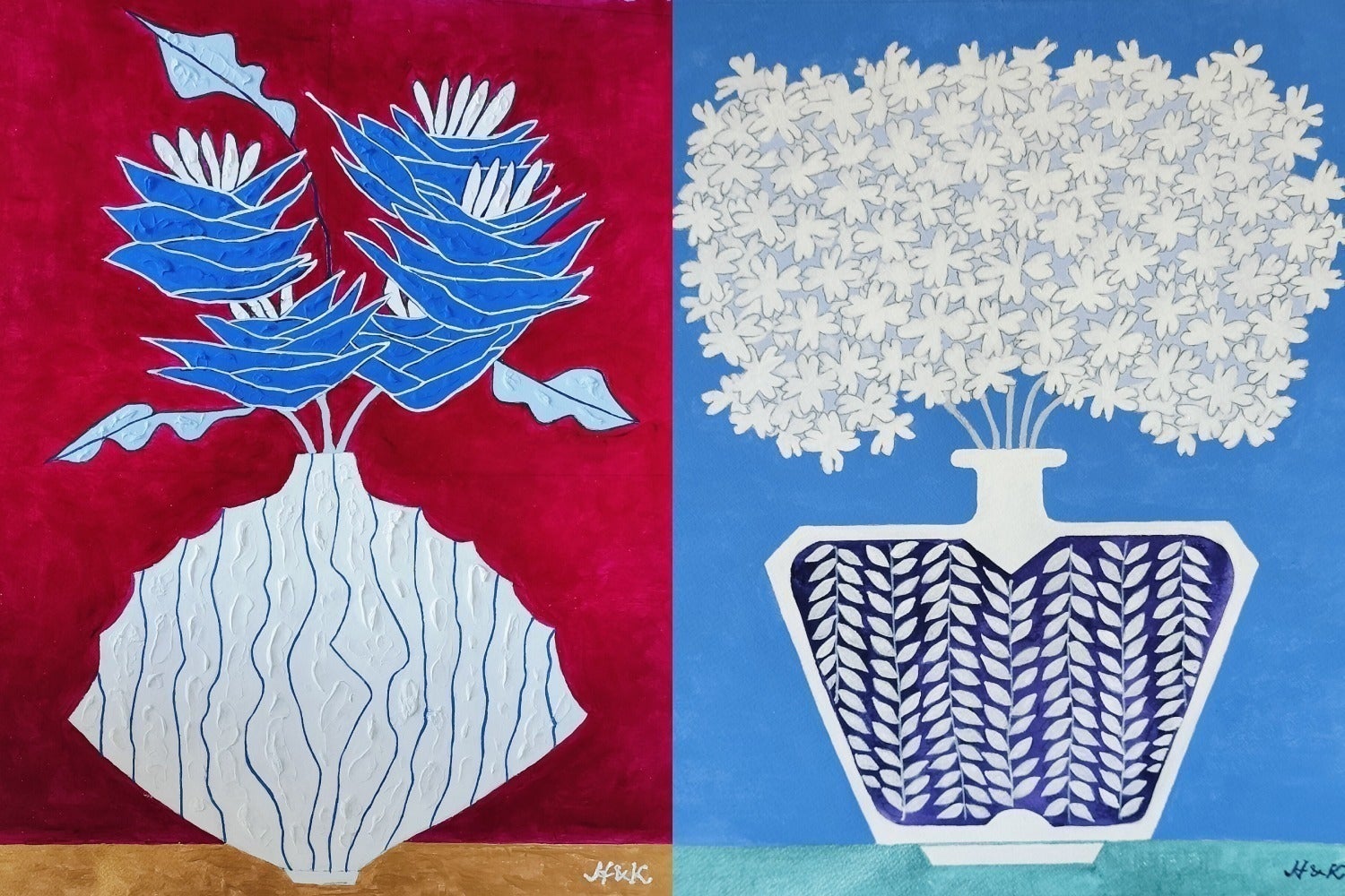 人生70年。まだ見ぬア−トの世界へ挑戦中です。この個展では、青と白の作品を通じて皆様に感動と挑戦の大切さをお届けしたいと思っています。私は、60歳で第一線を退き引退生活に入りました。40年間中断していた剣道を再開。6段となり現在中学校剣道部活を指導しています。70歳を超えた頃、学生時代に学園祭で上映していた黒澤明の「赤ひげ」を見て感動し、映画の素晴らしさを知ったこと。雑誌プレジデントで触れた司馬遼太郎のファンになり、司馬文学本を読みあさり歴史を知ったこと。女流陶芸家「ルーシー・リー」の茶碗のデザインと洗練された青の美しさに圧倒され、本気で陶芸に打ち込みたいと思った感情などが蘇って来ました。妻が「色彩研究所」を主宰していたこともあり、地球の自然の美しい色の魅力を深く知り、色彩感覚への多大な刺激も受けました。恐らく、そんなすべての思いが絵画への挑戦に繋がったのだと思います。作品は、青と白をデザインしたモダンなアクリル画です。人間は生まれる前から自然の美し色が遺伝子に組み込まれていると言われます。私は、その自然が生み出す美しい色「水・海・空」の青と「雪・雲・光」の白をどこまでも追い求め表現したい。「個展」という場を借りて新しいア―トの世界を多くの皆様に見て頂き、皆様の新しい挑戦のきっかけになればと思っています。ご支援頂いた皆様に感謝を込めて、一緒にこの挑戦を実現し、それぞれの人生に彩りを添える個展にしていきたいと思います。