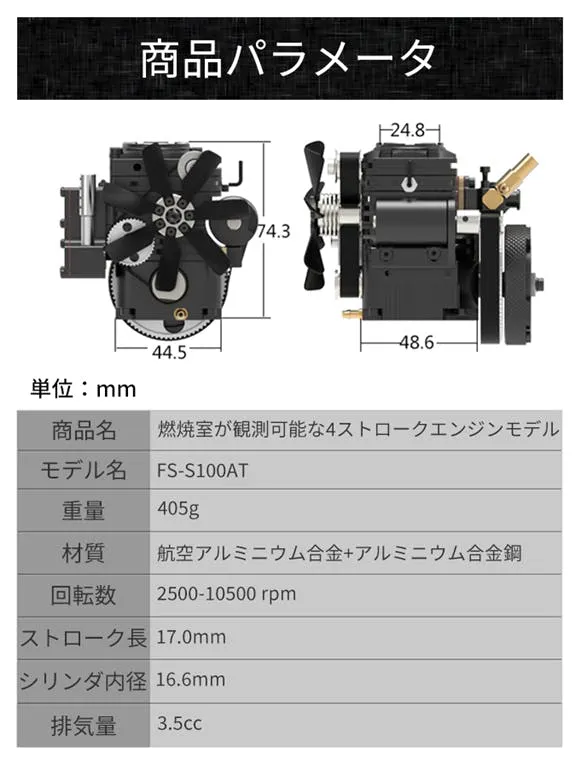 燃焼室を目で見て楽しめる、超本格4ストロークエンジン「FS-S100AT」。