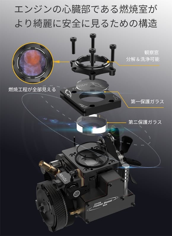 その厳しい条件にも耐えられるよう、観察窓には二層構造の特製ガラスを採用。安心して、燃料が燃え、ピストンが躍動する“本物のエンジンの鼓動”を目で追うことができます。