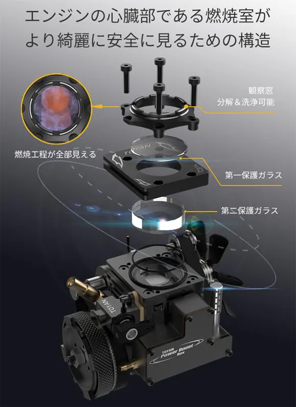 燃焼室を直接観察できる斬新な構造で、燃料が爆発し、ピストンが動く一連の動きを目で追える。従来の模型やおもちゃでは味わえない、心を揺さぶる“本物のエンジン体験”がここにあります。