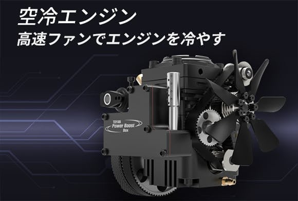 Toyan Engine FS-S100AT では、サウンドを最大限楽しめるよう 空冷式冷却 を採用。エンジンの動力で冷却ファンを常時駆動し、外気を冷却フィンに送り込むことで、効率よく熱を逃がします。熱による性能低下を防ぎつつ、力強く響くエンジン音を手のひらで体感できます。