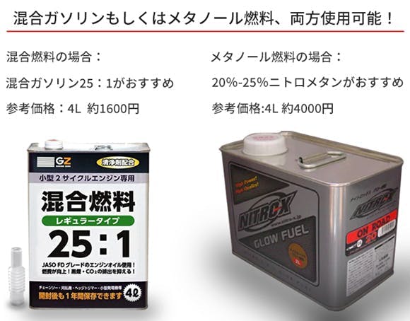 A:ラジコン専門店やホームセンターで購入できます。また、本モデルは混合ガソリン・メタノール燃料のどちらも使用可能です。