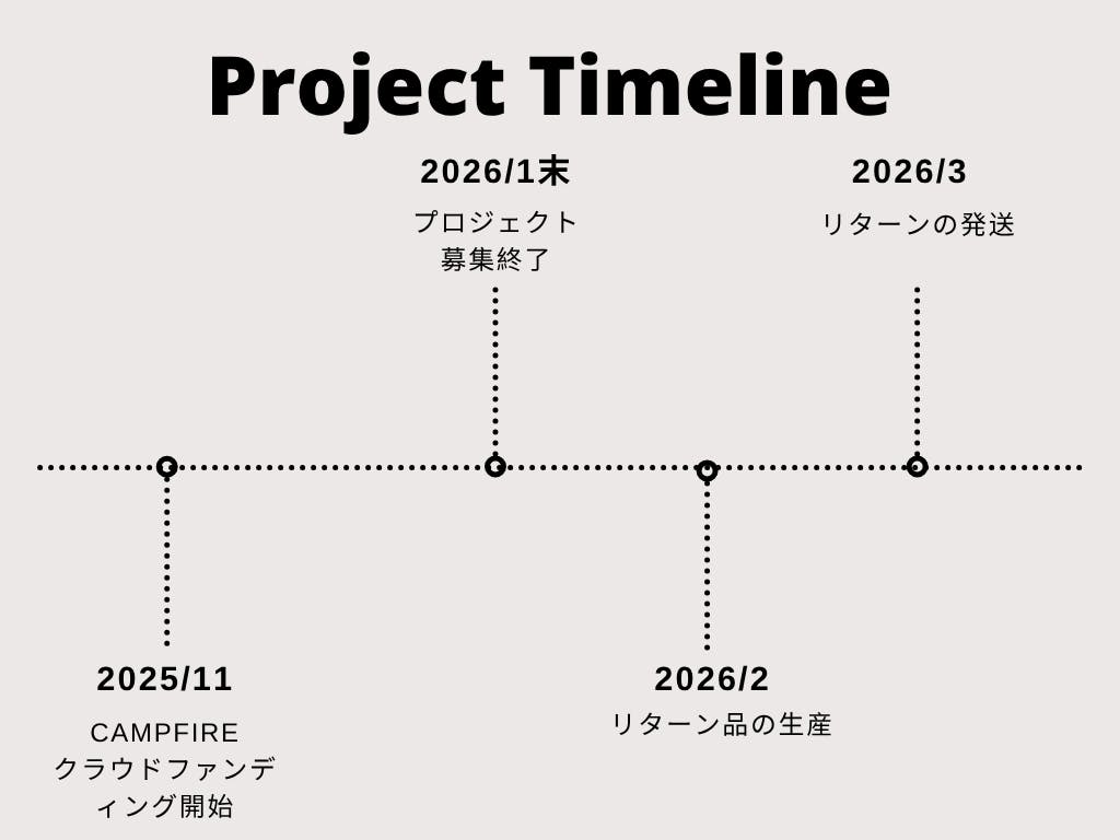 ◯ 商品引渡しまたは役務提供の時期:各プロジェクトが募集期間内に成立した場合のみ、支援金の決済が行われ、約定されたリターンを得る権利が発生します。なお、リターン毎の発送(履行)時期は各プロジェクトの記載・連絡に準じます。諸般の事情により遅延・遅配が生じる場合は、プロジェクトオーナーより記載・連絡されるものとします。