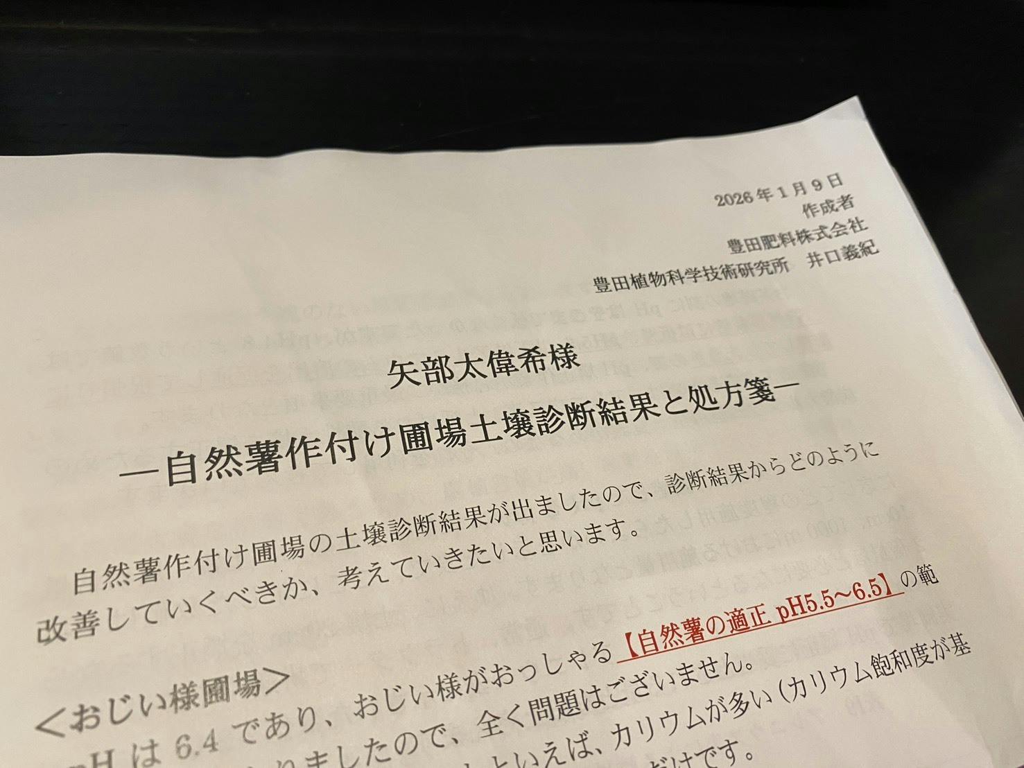 2026/01/24 20:30晴天が続き、着々と栽培に向けた準備が進んでいます!土壌に関しては、荒廃農地から再生後、初めての植え付け!取り組みに共感して下さった豊田肥料株式会社様が、専属の土壌医さんをつけてくださいました!祖父の畑は流石!ほぼ100点満点の数値でした!私の畑も植え付けに向け、適切な土壌作りに取り組んでいます!皆様に美味しい自然薯が届けられるよう、精進致します!! もっと見る