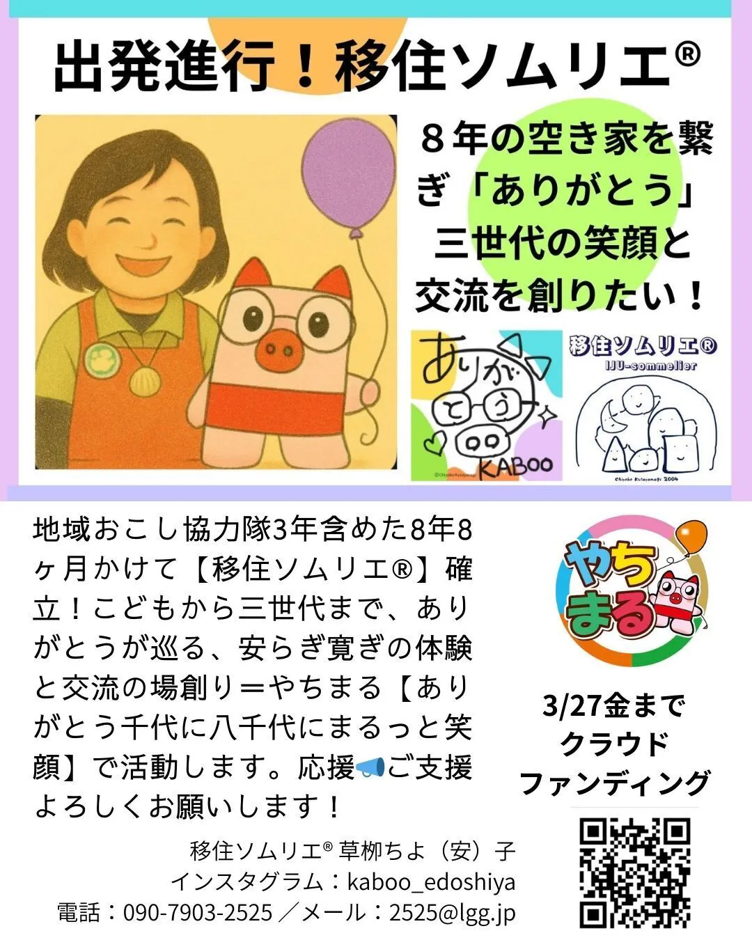 応援ありがとうございます。寝ている間に、目標の50%を超えるご支援をいただきました!本当にありがとうございます。残り6日、最後まで『安らぎと寛ぎ』の風を吹かせながら走り抜けます!今日はイチオシのリターンのご紹介です。【やちまる=ありがとう千代に八千代にまるっと笑顔】開催応援です!★今までの、旧やちまるとは?伝統製法の無形文化財の和紙にプロ用画材の油性色鉛筆でKABOOをお絵かき!交換で八千代町のお茶とお菓子(KABOOクッキー)とカップ麺(ヴィーガンヌードルなど)を試飲試食して、やっちぇよ八千代ゲームや思い出のミライすごろくで遊ぶ体験型ミニマルシェ。こども食堂、障がい者施設さんのカフェ、入浴施設のあるキャンプ場、町民公園や桜の名所の神社などで提供してきました。高校生や大学生のボランティアさんにも手伝っていただき楽しんでもらえ、観光で来た方も、地域のおじいちゃんおばあちゃんも一緒に交流して大変喜んでいただけました。地域の宝はこどもたち。笑顔で楽しいと喜び地域を大好きになってもらう。地域おこし協力隊にぎわい創出プロジェクト担当で、私が3年間茨城県八千代町で実施した「三世代まるっと笑顔で八千代町」の略です。★これからの、新やちまるとは?やる事は同じなのですが、目的が違います。新やちまるは、こどもも大人も、心を尊重して豊かに満ちあふれる、居心地の良い居場所で、ありがとうが巡る体験と、安らぎと寛ぎの交流を通して、人生を楽しんでいただくことが目的です。特定の場所や地域や何処を超えて、心が先に動き、行動すること(体験と交流)によって人生が展開していく。安らぎと寛ぎの未来を創出する。それが、移住ソムリエ®︎のやちまる「ありがとう千代に八千代にまるっと笑顔」です。★違いは???にぎわい創出ではないです。ただし、結果として、にぎわいにつながる可能性はあるという事は、ご想像いただけると思います。詳しくは最後の、ありがとうの感謝を込めてに書きました。★ポイント・目標額に届かなくても、ご支援いただいた範囲内で【必ず1回】開催します。 ・備考欄に「ここでやってほしい!」という希望地をご記入ください(神社、こども食堂など) 『私の街のこの公園に来て!』などリクエスト大歓迎!自宅、幼稚園、保育園や学童、介護福祉施設、マルシェやイベント内企画など、ご相談も可能です。・ちよちゃんからの「ありがとうメール」と、開催時の写真たっぷりの活動報告をお届けします。★これまでやちまるを開催してきた場所①東蕗田天満社(八千代町)②グリーンビレッジ(八千代町)③オハナこども食堂(八千代町)④ショップベルあじさいさん(八千代町)⑤やちおん(八千代町)⑥公民館や図書館(八千代町)⑦五所駒瀧神社(桜川市真壁)⑧お茶NOMAさん(下妻市)★提供と開催期間開催や活動報告は、2026年5月〜12月の間で、施設様側と調整して順次開催します。★試飲試食についてお茶・お菓子・カップ麺の無料試飲試食は、ご支援額に応じて数量限定または無しの場合があります。一部有料となる可能性もございます。キッチンカーは同行しません。やちまる再開、開催を応援いただける皆さま、どうぞご支援をお願いします。★ありがとうの感謝を込めて地域おこし協力隊3年目の東蕗田天満社さんでは、22日間で3,442人の来場者を迎え、地域のおばあちゃんから「こども達が楽しいと喜んでいる。神社を有名にしてくれてありがとう」といただいた言葉は、私の宝物です。活動の集大成として、こども達が描いた約1,000枚の絵を写真集にまとめ、町の図書館・こども食堂・神社に寄贈しました。また、町のキャラクターの八菜丸(はなまる)のぬいぐるみを携帯してPRし続けたことで認知度も高まり、地域の公共施設5箇所に寄贈することができました。この3年間の経験を通して、何よりも、こども達の笑顔に私自身が元気と勇気をもらいました。幸せな時間だったんです。任期満了後、やちまるを仕事でやりたい!!!6ヶ月動きましたが、【集客できるの?売上は?】結果、数字を求められるイベント企画運営事業の高い壁は、私には越えられませんでした。そこで【にぎわい創出】ではなくて【心を満足させる体験と交流機会の創出】に移行しました。「やちまるという心の居場所を、私が創る。」これが私の心からの願い、本当の想いです。「ありがとう千代に八千代にまるっと笑顔」やちまる再開、やちまるの開催。本心の再出発です。KABOOと移住ソムリエ︎®︎の仲間たちと一緒にまた遊びましょう!あなたが遊びにきてくれること。あなたが笑ってくれること。それだけで嬉しい。それが私の喜びで、心が豊かになる幸せな時間で、心からの【ありがとう】です。またあの笑顔の時間を創らせてください。皆さんの温かい応援を、どうぞよろしくお願いいたします!【ありがとうが巡る】やちまる再開応援!あなたの選んだ場所で開催します(5,000円)リターン一覧から、ぜひチェックしてみてくださいね!★8年8ヶ月かけ