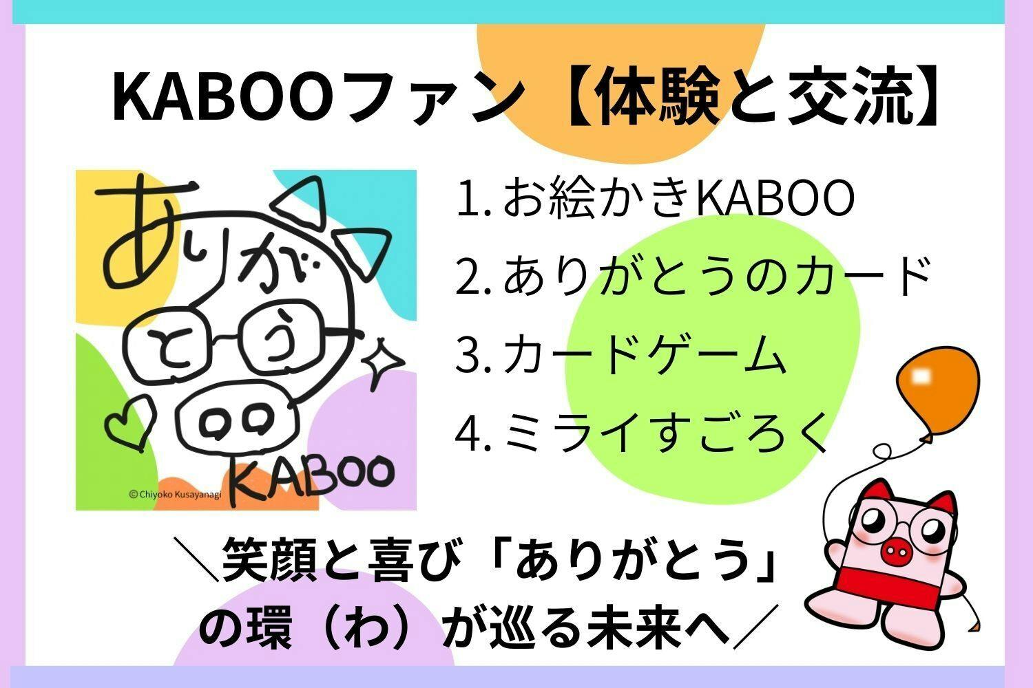 ② KABOOファンの開催:KABOOを描くありがとうのお絵かきや、ミライすごろく、カードゲームのワークショップを通じて、「こどもが笑顔で遊び、ママが安らぎ、三世代が寛げる交流の場」 を開催していきます。