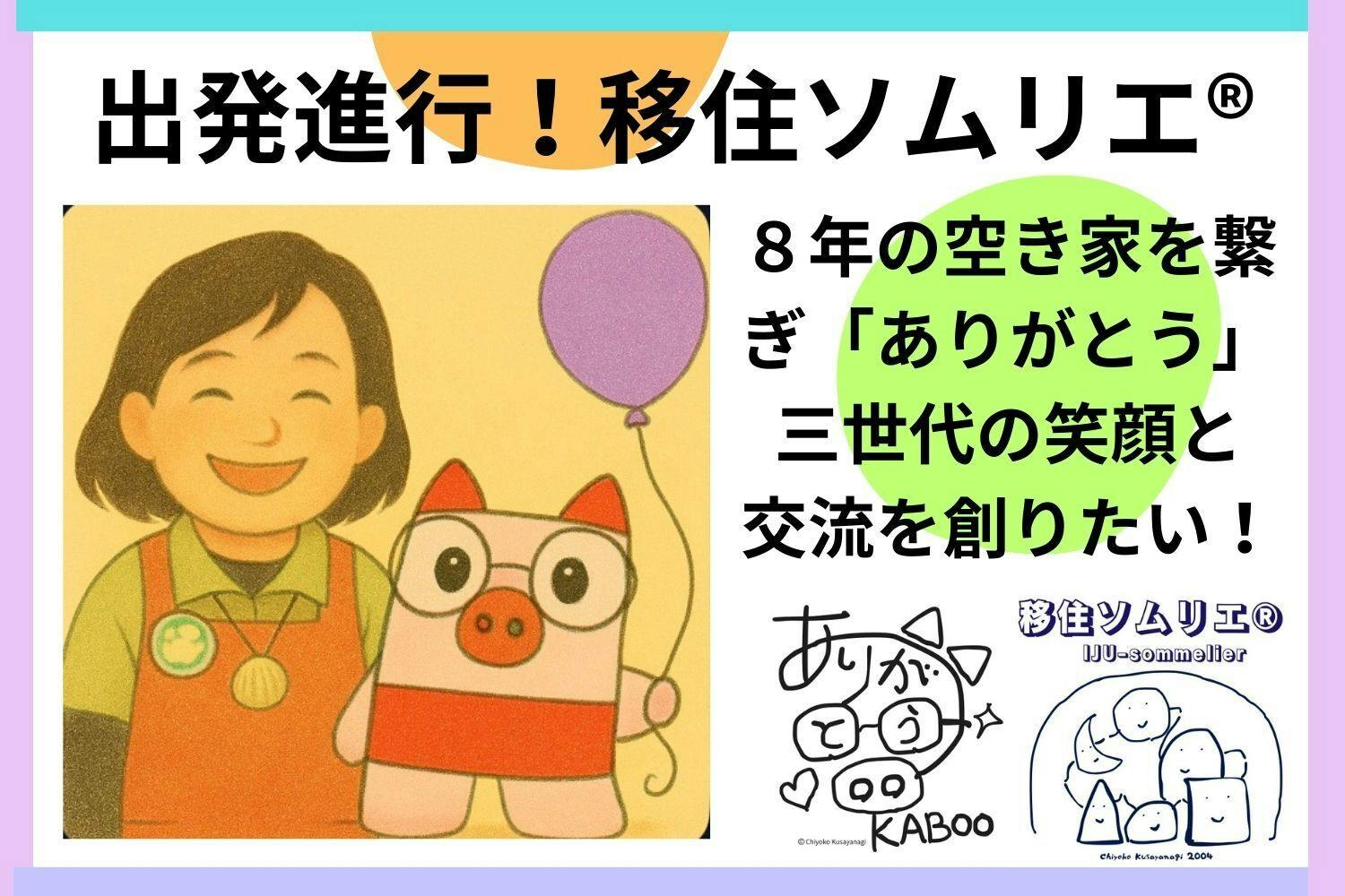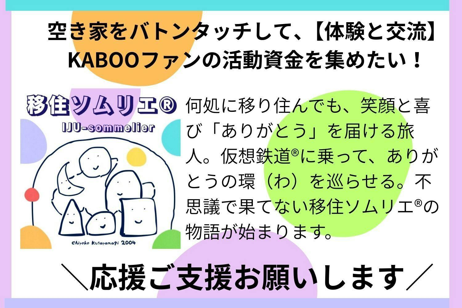 2026/03/04 12:03クラウドファンディング開始のご挨拶今朝、目が覚めたらご支援第一号をいただいていました!親友からの温かい応援に、涙が止まりません。ゼロからの出発でしたが、ついに私の『移住ソムリエ®︎』としての旅が始まりました!」はじめまして! お絵かき詩人で移住ソムリエ®︎の草栁安子(ちよこ)ちよちゃんです。出発進行!移住ソムリエ®︎8年の空き家を繋ぎ「ありがとう」三世代の笑顔と交流を創りたい! がスタートしました。…実は開始一週間、ご支援ゼロ円でした。理由は、プロジェクトページを書き上げリターンは決めましたが、移住ソムリエ︎®︎の商い、本当にやりたいことが初日を迎えても固まらなかった為、誰にも連絡していなかったからです。45歳から移住ソムリエ︎®︎名乗り続けて、ずーっと移住ソムリエ︎®︎って何なの??問われ続けて答えられず8年…。クラファンのための今までの活動の棚卸し、地域おこし協力隊含めた経験の振り返り、母との別れや自分自身を見つめ直して。ようやく!クラファンスタートして一週間後にやっと、言語化出来ました。8年かけて辿り着いた「移住とは?」移住ソムリエ︎の商い、まとめました。・全文をnoteで読みたい方はこちら。【移住とは?】8年かけて辿り着いた、移住ソムリエ®︎の『商い』のカタチhttps://note.com/iju/n/n5034818934e0移住とは①心の移動 ②心が動くこと ③心を尊重し満たすこと地域や特定の場所や「どこに住むか(Where)」を超えて心の動きと行動で人生が展開する(IJU)こと心が豊かに満ちあふれると、居心地の良い“居場所”となり、理想の移住先となる。こどもも大人も、本来の心を尊重し、生き生きと易々と、やりたいことで輝きながら、人生という体験を思う存分楽しむこと。それこそが移住の源である。移住ソムリエ︎®︎とは何処に移り住んでも心豊かに生きる在り方(IJU)を祝福し、ありがとうの環(わ)を巡らせ、安らぎと寛ぎの未来を創ります。心豊かに生きる在り方=移住ソムリエ︎®︎のIJU・I=Intention(インテンション/意図する)暮らし方関わり方を自分で選び決めること・J=Joining(ジョイニング/つながる)人やコミュニティとつながること・U=Unfold(アンフォールド/展開する)心を開き可能性を咲かせ人生を展開していくこと移住ソムリエ︎®︎の商い①寛ぎ【KABOOファン】親子向け/体験と交流大好きな大切な人にありがとうをプレゼントするお絵かき体験、思い出のミライすごろくなど→未来から来たありがとうの旅人KABOO(かぶぅ)と宇宙の移住ソムリエ︎®︎達と一緒にありがとうの環(わ)を巡らせる仮想鉄道®︎で不思議な旅にでかけよう!②安らぎ【冥土のお茶会 Move to YOU】〜心を動かし本来の自身に移住するお茶会〜大人向け/夢や理想を話すことで自分の想い、本音、心を尊重する→人生、体験してナンボ。天国に持って行けるのは思い出だけ。全て冥土(めいど)の土産話!心動かし、行動しましょう!!キャッチコピーひとりじゃないよ。あなたはいつも尊い存在。You are not alone. And always, you belong.ビジョン/未来:自分を大好きになって、自身の大ファンとして、理想や夢を叶えて、人生の全ての体験を喜び楽しむ世界ミッション/使命: 豊かな心を尊重する、こどもと大人が共に、易々とやりたいことを実現する、笑顔あふれる社会の創出志: 目の前のひとりを大切にして、好きやりたい得意を発揮して、喜ばせて笑顔にするゴール(私自身の):①社会の中で人と交流しながら、生涯かけて移住ソムリエ︎®︎の商い(あきない)を楽しむ②好きなことやりたいこと夢や理想を易々と実践する安らぎの人に成れるよう生きる日々の中で、母から貰った名前に感謝し、母の願いを叶える出発進行でーす!8年かけて創りました移住ソムリエ︎®︎。抱えていた空き家をバトンタッチし、こどもから大人まで三世代、ありがとうの環(わ)を巡らせる体験と交流で、移住ソムリエ︎®︎KABOOとキャラクター達と笑顔でご一緒しましょう!そのための出発記念式典=クラウドファンディング、ようやっと開幕、出発進行です!移住ソムリエ︎®︎のお披露目祝賀パーチー!!ぜひ記念切符=リターンをご覧ください。各地を旅するKABOOの可愛い写真や、地域おこし協力隊の時に私が撮った茨城県八千代町のキャラクター白菜の八菜丸の写真。空き家を代表して、長野県の木祖村の「江戸枝屋」のお孫さんに描いていただいたKABOOの絵の写真【KABOOの宝物】や木祖村の思い出の写真など沢山ご用意しました。こういうの好きかも!という方がいらっしいましたら、ご紹介いただけたら、嬉しいです。最終日3月27日まで安全運転で運行します。ぜひ踏切や駅で見かけたら手を振ってくださいね。車窓からKABOOと一緒にありがとう笑顔のポッポッポー!!!応援よろしくお願いいたします!移住ソムリエ®︎・お絵かき詩人ちよちゃん草栁安子(ちよこ) もっと見る