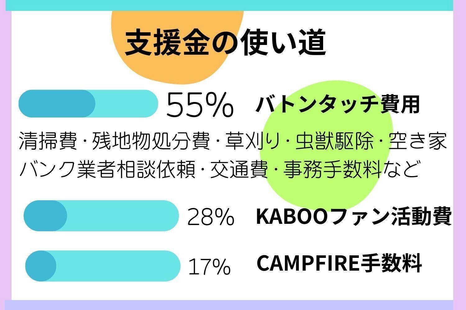 皆さまからいただいた大切なご支援は、「空き家をバトンタッチするための活動とKABOOファンの活動費」に活用させていただきます。