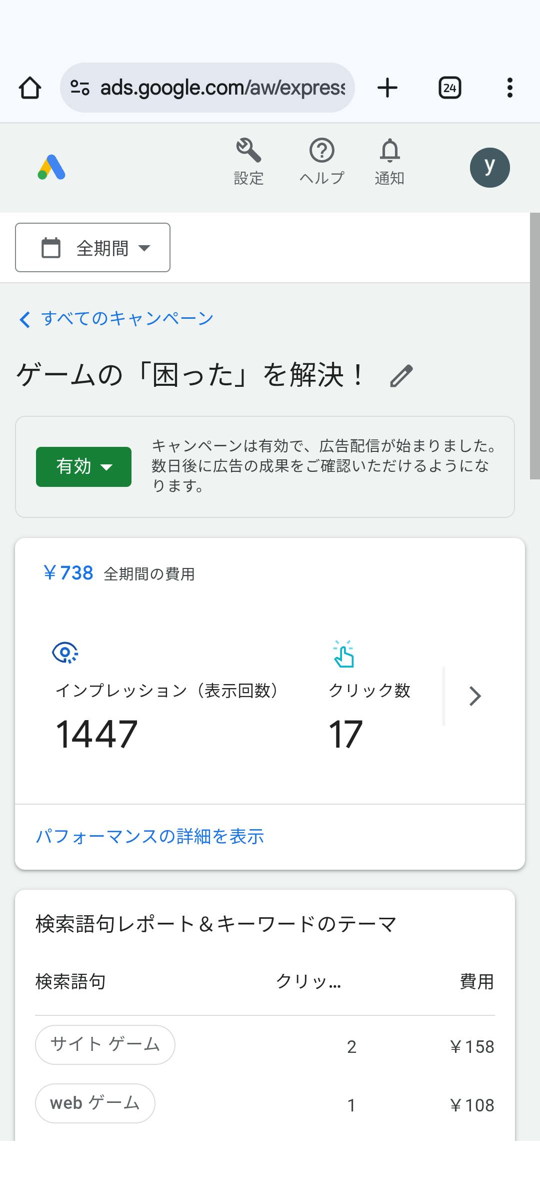 2025/10/13 08:11ご閲覧ありがとうございます、ゲーマーズギルド代表の上野です。https://gamers-guild.jp本プロジェクトでご支援いただいた資金はGoogleリスティング広告に使用すると明示しておりますが、どのようなものなのか試験的に始めてみました。運用資金はスズメの涙程度ですが、実際にやってみた結果を提示致します。実際の画面は添付画像のようになりますが、インプレッション数(広告が検索結果画面に表示された回数)が1400回あたりで、そこからクリックされた回数は17回となりました。集計期間は1週間程度です。もしご支援いただきゴールに辿り着けば10倍以上の運用資金を充てられ、実用的な効果が出るものと考えられます。ご支援いただければとても助かります。ぜひご検討のほど、よろしくお願い申し上げます。 もっと見るクラウドファンディング開始から1週間で支援0!