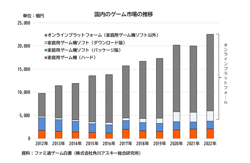 下記のグラフは経済産業省の公式ウェブメディア「METI」で掲載されていた国内のゲーム市場の推移ですが、コロナ禍(2019年末~2023年5月頃)にオンラインゲームの市場が明らかに伸びています。