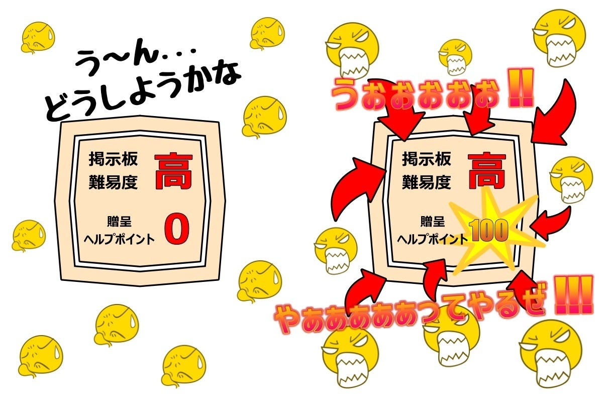 どうしても誰かに協力してほしい、早くゲーマーを集めたいときなどに、ヘルプポイントを報酬として設定することで自分の掲示板を「エコひいき」することができます。
