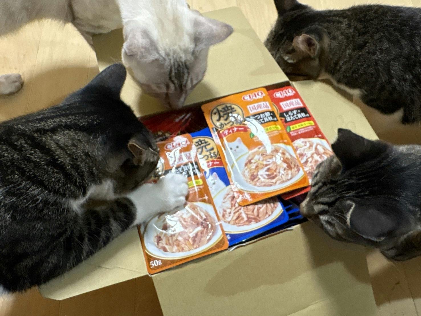 猫さんたちも届いた物資に興味津々で、毎日元気に過ごしています。
