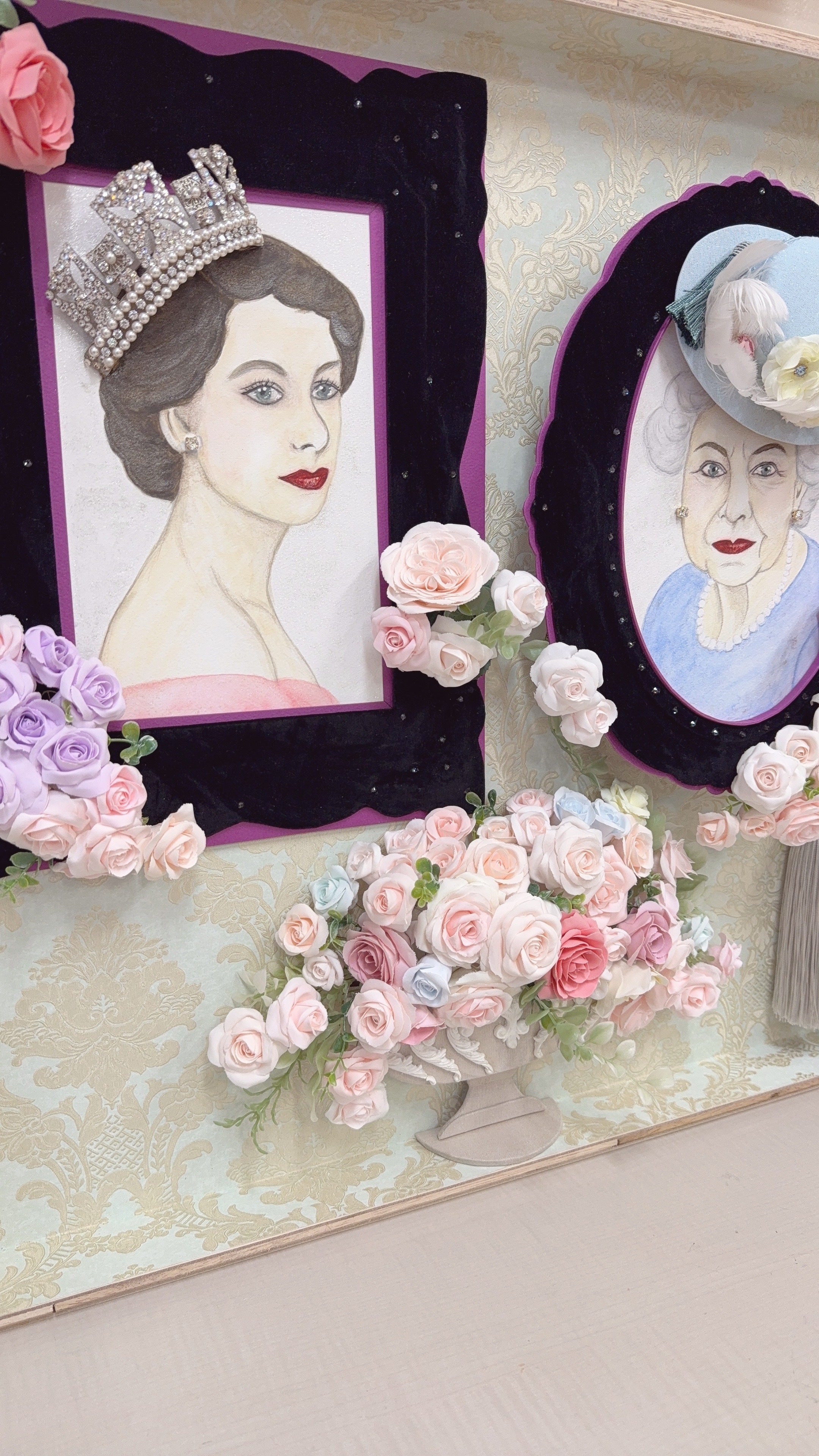 2025/12/09 19:23エリザベス女王生誕100年を祝う作品が、ついに完成しました!完成した作品を、私の通っている教会の皆さんに見て頂きました。皆様、自分の事の様に喜んで下さって、心から嬉しかったです。何より神様にも見て頂けて、心癒される素敵な時間となりました。実は8月6日に最愛の母を亡くし、悲しみに包まれていた時、突然ロンドン出展の話が舞い込んで来ました。しかも葬儀の日でしたので、戸惑いもありましたが、母が自分の道を歩みなさい!と背中を押してくれたのだと確信し、ご依頼を受ける事に致しました。葬儀を無事に終え、次の日からすぐに制作に取り掛かりました。作品に集中する事で、悲しみを感じる暇もなく、ただただ楽しいと思える感情が湧いてきた事に、私自身とても驚きました。今回は「エリザベス女王」に因んだ作品を!と言う難しいオファーでしたが、自分を成長させる為にも、初めての水彩画と、薔薇の制作に力を入れました。特に私の屋号Sweetjuliet は、大好きなイングリッシュローズから名付けた事から、粘土で花びらから、一枚ずつ制作しました。合わせて、クイーンエリザベスの薔薇も制作し、全部で100本作り上げました。こちらの作品は、ロンドンのマル・ギャラリーと、京都・京セラ美術館にて展示されます。是非、皆様!私に会いにいらして下さい。完成した作品の前で、一緒にお写真を撮って頂けると嬉しいです☆ もっと見る