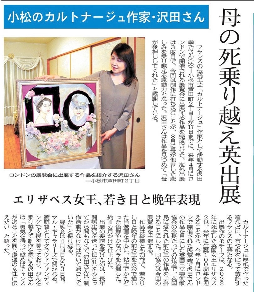 2025/12/20 20:40先日作品を梱包し、無事に発送致しました。発送前日には、新聞社からの取材も受け、今回の制作が改めて大変だった事を実感致しました。それは、最愛の母を8月に亡くした事…。7年間という長い時間を支えてきて、覚悟はしていましたが、とても辛く悲しい出来事だったのです。しかし制作する事で、自分を取り戻す事も出来ました。母からの教えは、思いやりを大切に、人への感謝を忘れない事!ごく平凡な私が、勇気を出して一歩前に踏み出せたのも、私の作品を見つけて下さった担当者さんのお陰です。戸惑う私をいつも支えて下さり、制作の楽しさや自由に表現する事の素晴らしさを、学ばせて頂いております。これからも、もっともっと!私らしく作品を作り続けていきたいと思います。ロンドンの地で展示される事を、今からとても楽しみにしています。 もっと見る