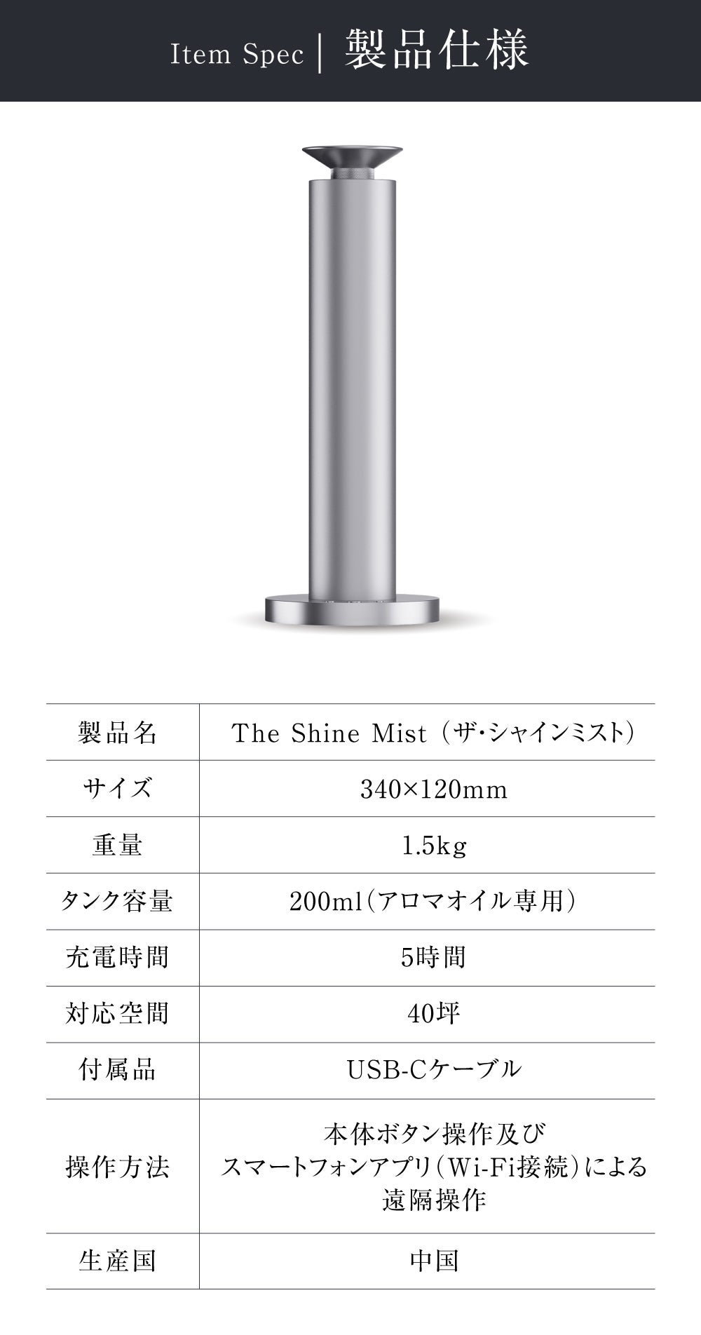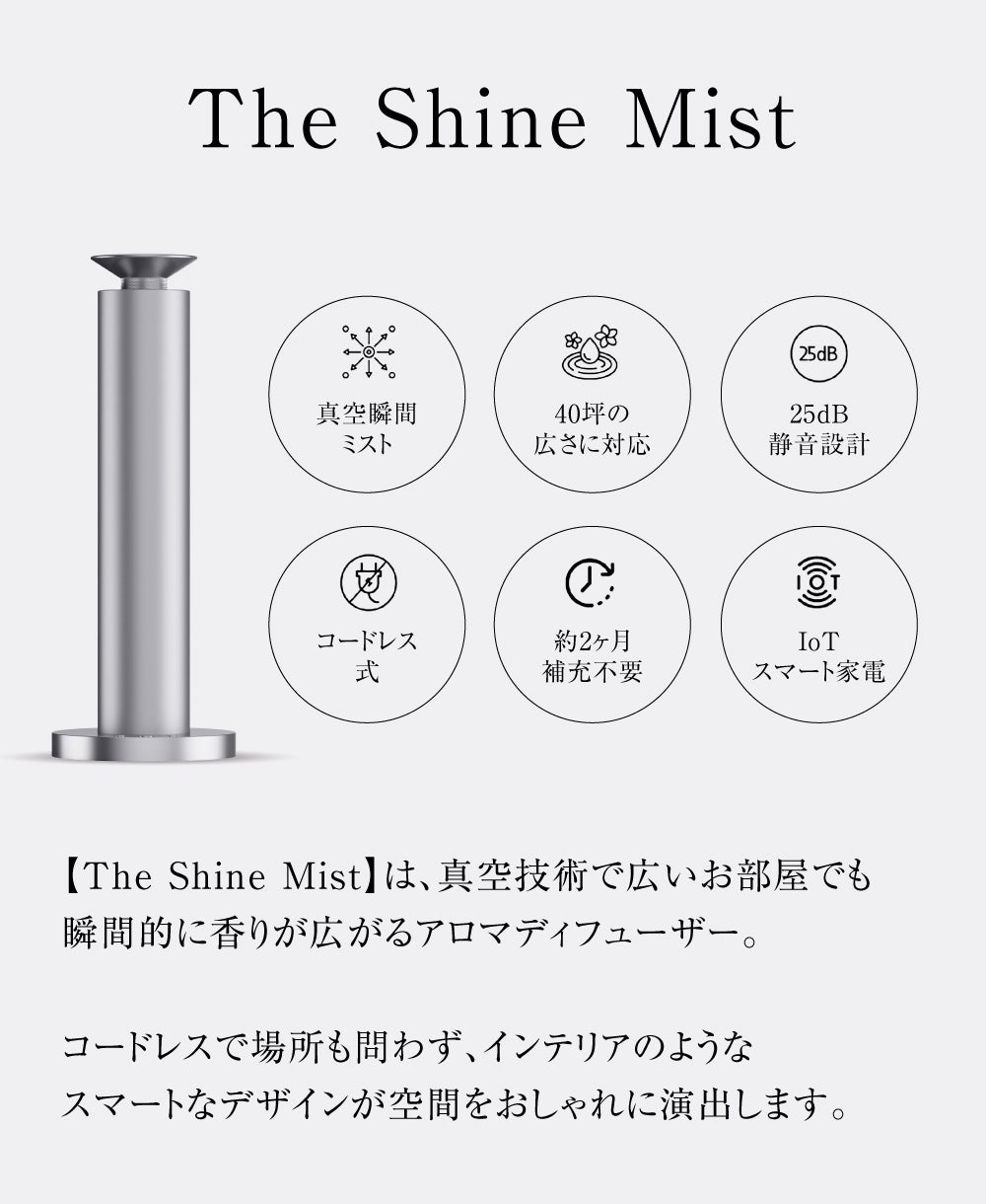 【The Shine Mist】は、空気の力を活かしてアロマを勢いよく拡散する「真空ミスト方式」を採用。
