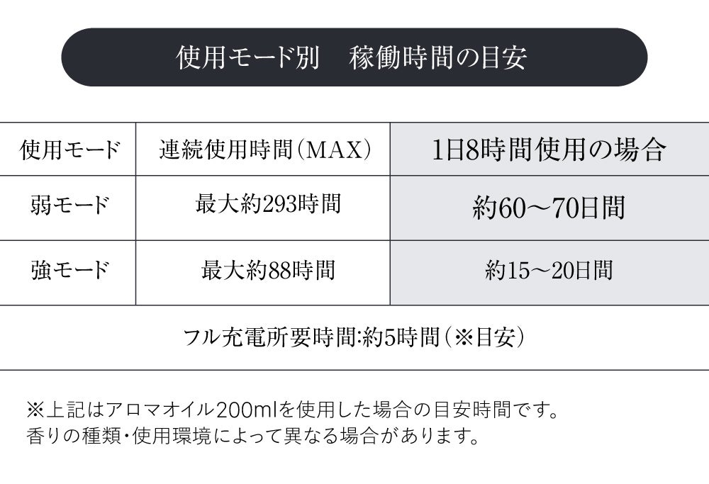 ※ご使用環境や香りの種類によって稼働時間は前後する場合があります。