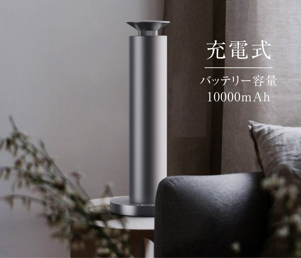 10000mAhのバッテリーを内蔵したコードレス設計で、コンセントのない場所にも自由に設置できます。タイマーは4段階(1・4・8・24時間)設定ができ、毎日8時間使用しても弱モードで約60日は連続使用可能。充電は約5時間で完了し、日常使いでも安心です。