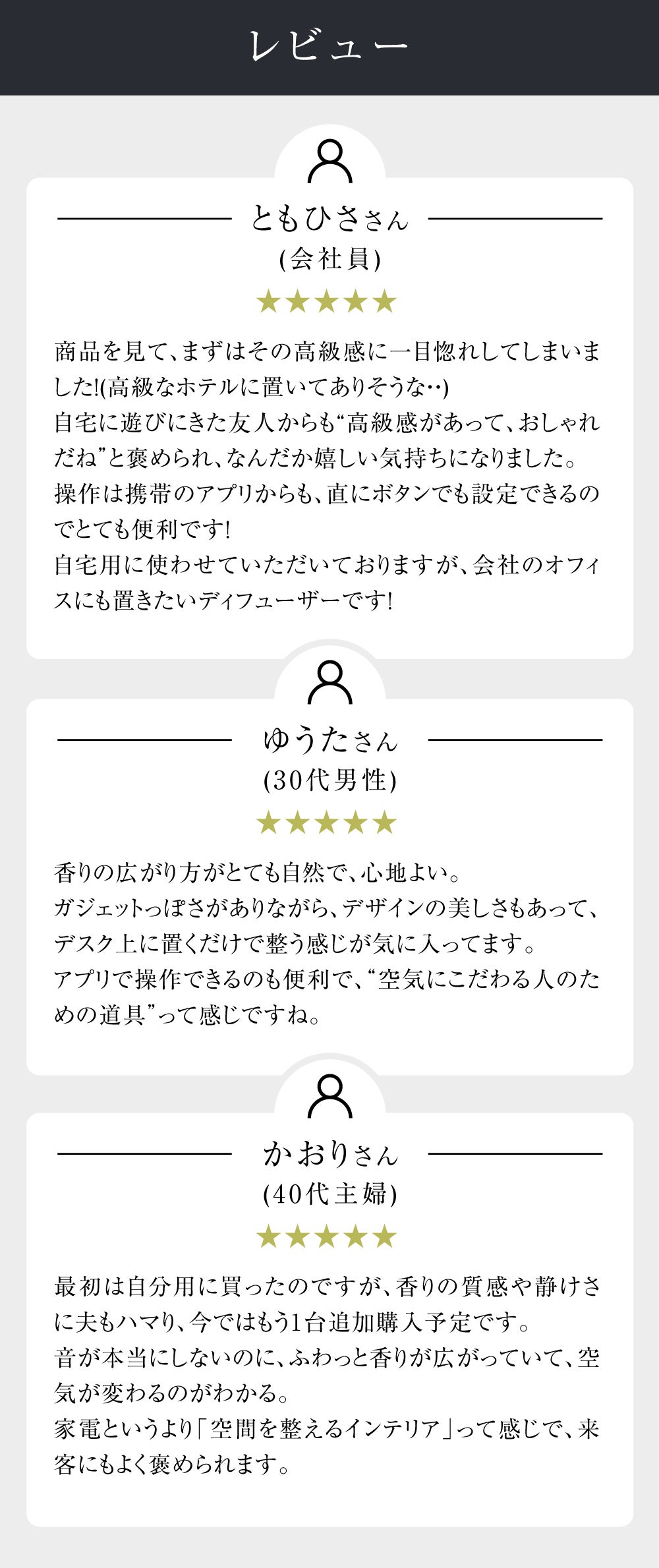 実際に使ってみると、香りが瞬時に空間に広がり、心から癒される時間に。さらに、シンプルで美しい佇まいが部屋になじむのもお気に入りポイントです。
