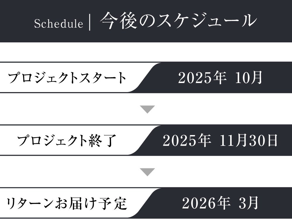 ●引渡し時期: 各リターン詳細に記載の発送予定月を引き渡し時期とします。但し、開発・生産状況によって遅れが生じる場合がありますのでその際は当プロジェクトページ内の「活動報告」または購入者へのメール等で連絡します。