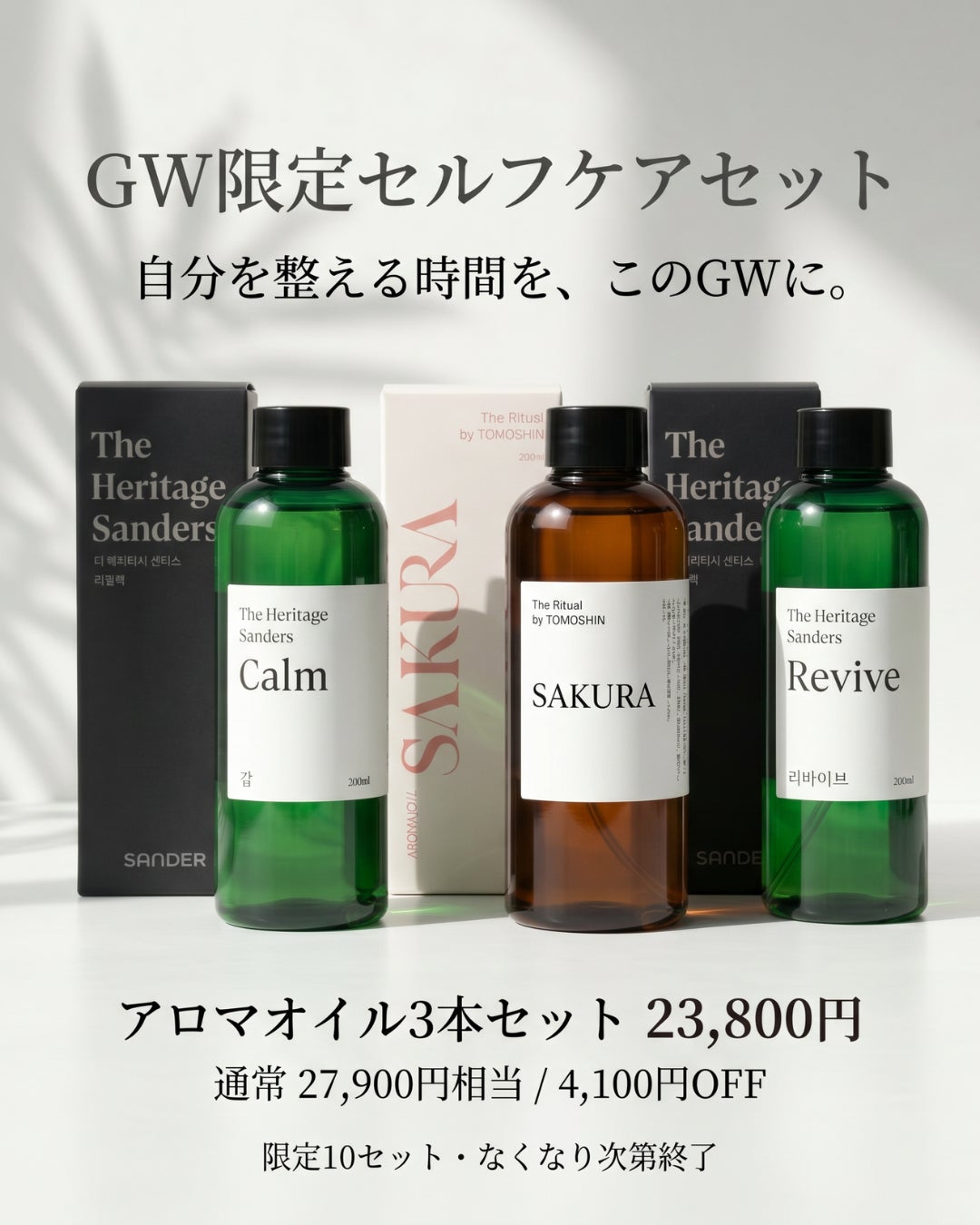 そんな想いから、アロマオイル3本をセットにした「GW限定セルフケアセット」をご用意いたしました。(※1~2営業日以内に発送)