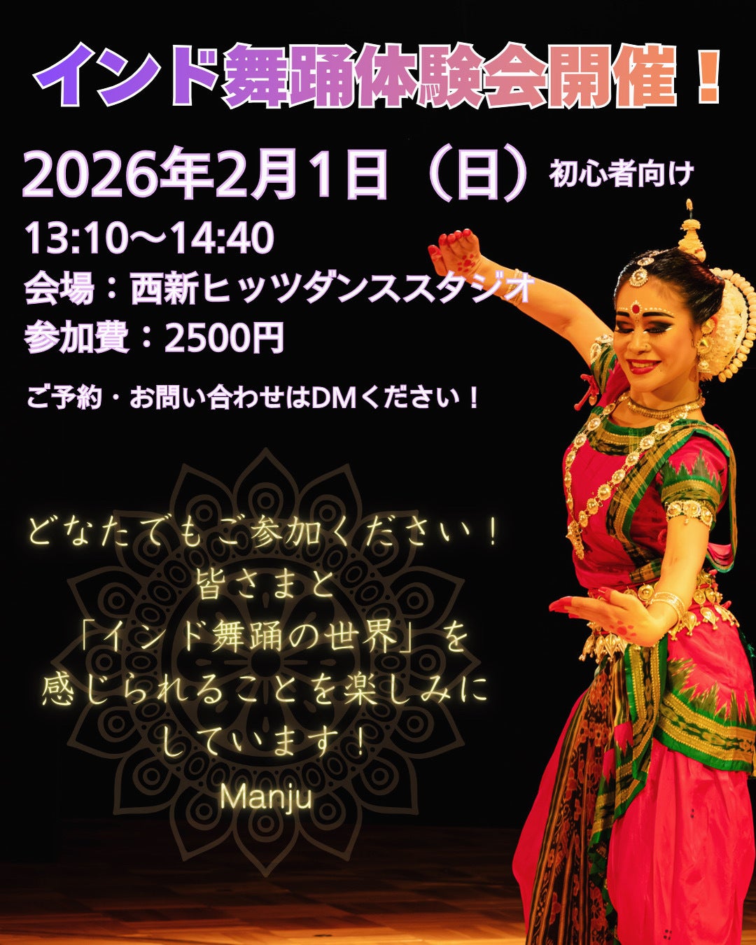 2026/01/31 16:53こんにちは♪Manjuです!明日から2月ですね〜!皆様いかがお過ごしですか?あっという間にソロ公演から1ヶ月以上が経ちました!!最近のManjuはと言いますと、ソロ公演の動画データが届いたのでリターンのハイライト動画作成に取り掛かっております♡あの日の感動がまた鮮明に蘇り、感謝の思いで編集作業をやらせていただいてます!完成楽しみにしてて下さいね!そして公演のDVDもそろそろ完成いたします!!ご予約注文のみとなりますので公演に来られなかった方や、またインドの踊りの世界を感じたい方は是非よろしくお願いいたします!そしてここからが本題です♡クラウドファンディングから公演チケットをご購入頂いた方々へのリーターンの一つのインド舞踊体験会がいよいよ明日となりました♡体験会は一般参加も受け付けていますので、この機会に体験してみたい方おられましたら、是非ご参加ください♪体験会のご予約はこちらにメッセージください⇩manju.odissi@gmail.comお気軽にご参加下さい♪日時:2026年2月1日(日)13:10〜14:40※スタジオには13:00よりご入室いただけます。講師 Mamju一般参加参加費:2500円 会場:西新ヒッツダンススタジオHIT'S DANCE STUDIO福岡県福岡市早良区西新4-7-17(2F)Aスタジオ⭐︎更衣室あります【持ち物】 ・お水 ・タオル ・動きやすい服装(上:TシャツやロンT/下:ストレッチのきいたレギンスや足を開きやすいパンツ)※裸足で行います。明日皆様にお会いできるのを楽しみにしています!お気をつけてお越しください♪Manju もっと見る