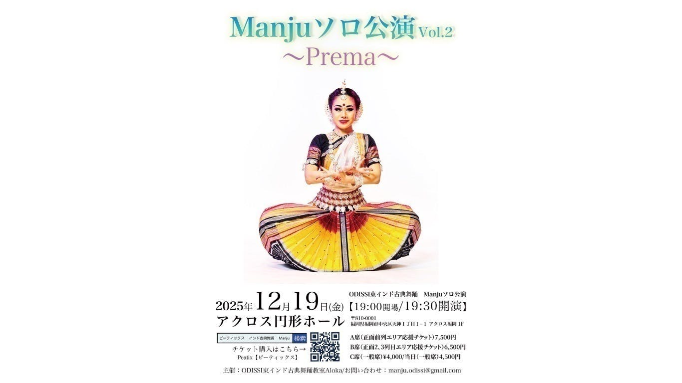 2025/11/23 17:54皆様いかが過ごしですか?私は公演に向け準備を着々と進ませております!!まだまだまだ沢山やる事ありますが、お陰様で楽しくやらせていただいてます♡当日のことはもちろんですが、毎日をどう生きるのかという事を今まで以上に感じさせて頂く時間になっております。毎日があっという間に過ぎていきますが、踊りにたくさん向き合えるほんとにありがたい日々です。踊りに向き合っているということは、人生に、生と死に向き合っているという事です。何故こんなに踊るのだろう。何故ここまでやっているのだろう。きっとそれは今まで私が歩んできた道があったからです。話すととても長いし、一言ではなかなか言えないので、私のヒストリーが気になる方いましたらお茶でもしましょう!!兼ねてから夢だった踊りをしっかり見ていただく空間、そこには私と皆さんがいます。この皆さんとは今の私が出来上がっている過程で繋がっている全ての方です。皆さんとその場で作り上げるエネルギーがさらに広がり外へと放たれていく。波紋が広がるように流れ繋がっています。ODISSIは踊るヨガとも言われるように、毎回のプラクティスで起きるもの、出会う自分は2度たりと同じトキはありません。当日のステージも二度とないものです。一度きりの時間。生まれては消えてゆく儚くもあるからかかけがえのないものそんなかけがえのない時間を全身で感じて頂けたら嬉しいです!その時のあなただからこそ感じるもの。その瞬間瞬間を皆さんと思いっきり楽しみたいと思っております。今日も素敵な1日を♡ManjuODISSI東インド古典舞踊Manjuソロ公演Vol.2〜Prema〜日時:2025/12/19(金)19:00開場/19:30開演会場:アクロス円形ホール〒810-0001 福岡県福岡市中央区天神1丁目1−1○西鉄福岡天神駅から徒歩10分○地下鉄空港線天神駅から徒歩5分(16番出口直結) A席(正面前列エリア応援チケット)7,500円一般発売/売り切れB席(正面2.3列目エリア応援チケット)6,500円/売り切れC席(一般席)4,000円残りわずか/当日(一般席)4,500円※当日券はお席が全て完売となった場合販売無しになります。チケットのお求め方法▼⚪︎ピーティックスサイト⚪︎Manjuに直接ご予約お問い合わせなどお気軽にどうぞ⇩◉manju.odissi@gmail.com◉InstagramDM ※A.B.C席は各エリア内での自由席となります。※お席を使うお子様はチケットが必要になります。※お膝に乗るお子様は無料検索・ピーティックス ・インド古典舞踊 ・ManjuODISSIは元々、ヒンドゥー寺院で奉納舞として踊られていた巫女舞を引き継いだ踊りです。ヒンドゥー寺院の彫刻を思わせる美しいポーズや目の動き、そして仏像を思いおこされるムドラーと言う手印で語られます。生きた彫刻とも言われる踊りです東インド古典舞踊ODISSI是非この機会に楽しんでください♡ もっと見る