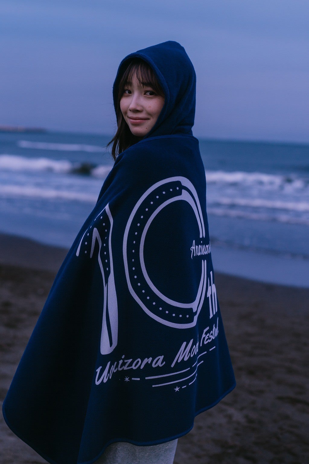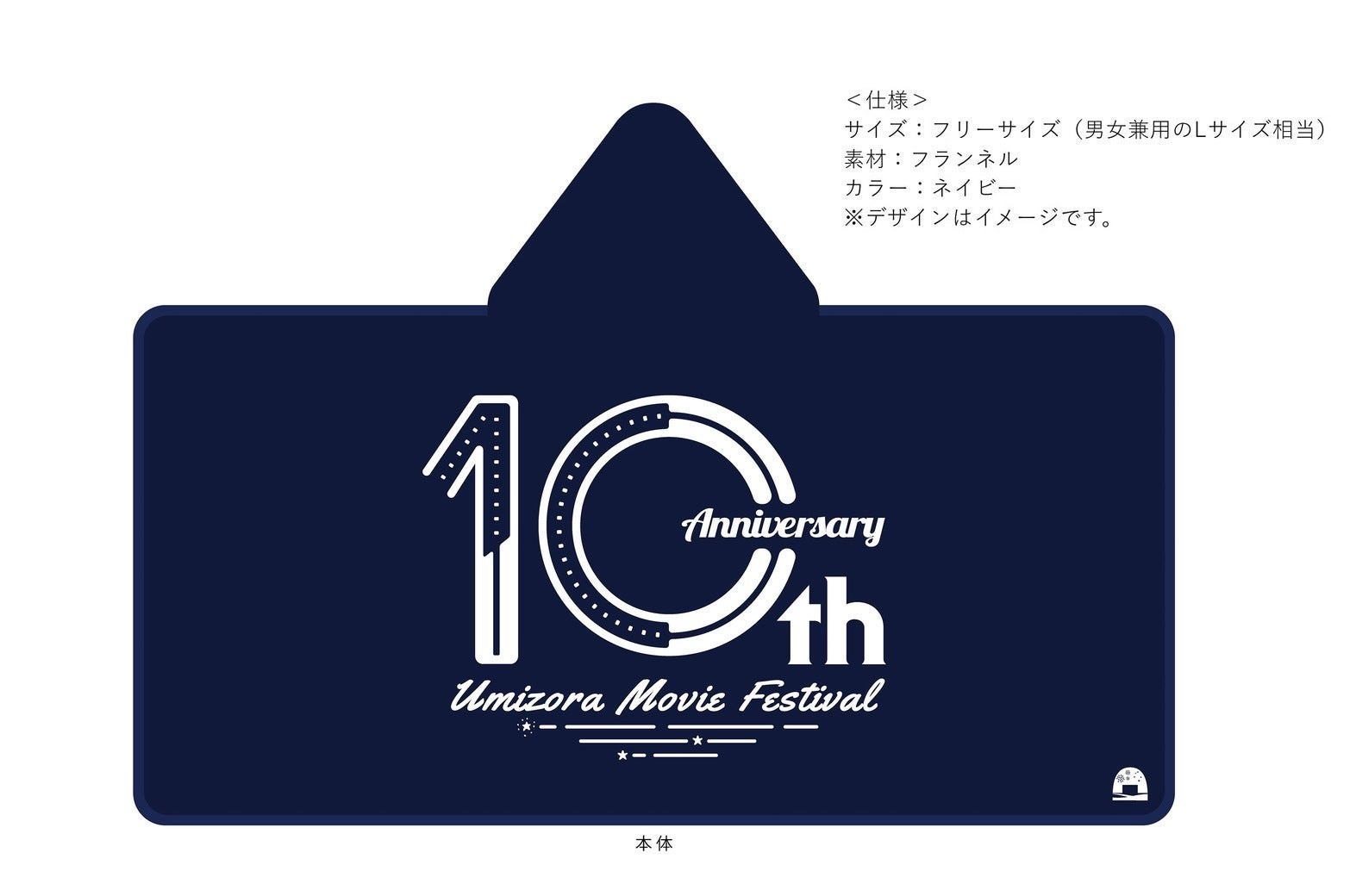 10周年を記念した、限定デザインのフード付きブランケット!砂浜での映画鑑賞など、少し肌寒い時にさっと羽織るのに最適です。