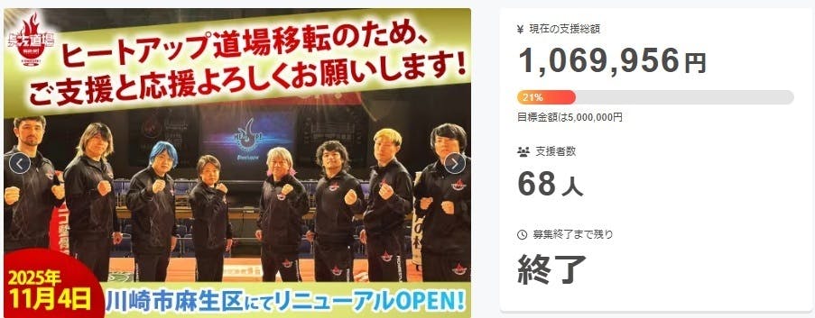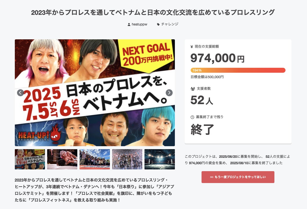 2025/12/26 00:30このたび、私たちのクラウドファンディングは無事に終了いたしました。まずは何よりも、ご支援・ご声援をお寄せくださった皆さまに、心より御礼申し上げます。本当に、本当にありがとうございました。結果として、68人もの方から1,069,956円と100万円を超えるご支援をいただくことができました。決して簡単な挑戦ではありませんでしたが、皆さま一人ひとりの応援が積み重なり、ここまでたどり着くことができました。正直に言えば、当初目標としていた金額には届いていません。悔しさがないと言えば、嘘になります。それでもこのクラウドファンディングを通じて、「プロレスで社会貢献を続けてほしい」「この活動を応援したい」そう思ってくださる方が、確かにいることを私たちは強く実感しました。それが、何よりの財産です。皆さまから託していただいた想いとご支援は、道場運営、地域活動、福祉・青少年支援など、これからのヒートアップの活動に、責任をもって活かしてまいります。ここからが本当のスタートです。結果も、活動も、きちんと形にして、「応援してよかった」と思っていただけるよう、一歩一歩、前に進んでいきます。今後も活動報告を通じて、道場の様子や、プロレスで生まれる笑顔をお届けしていきます。引き続き、プロレスリング・ヒートアップをどうぞよろしくお願いいたします。本当にありがとうございました。 もっと見る