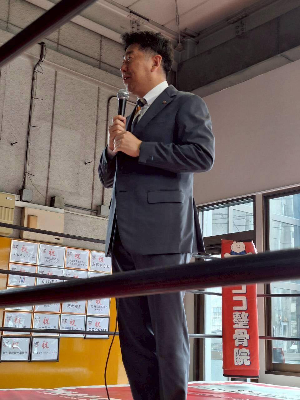 式典終了後、参加頂いた皆様と一緒にに懇親を深めておりました。すると、本日唯一参加していた三輪マーロン翔太選手が、なんとTAMURA☆GENE☆ に対戦を要求!急遽新道場での初めての試合が開催されました。