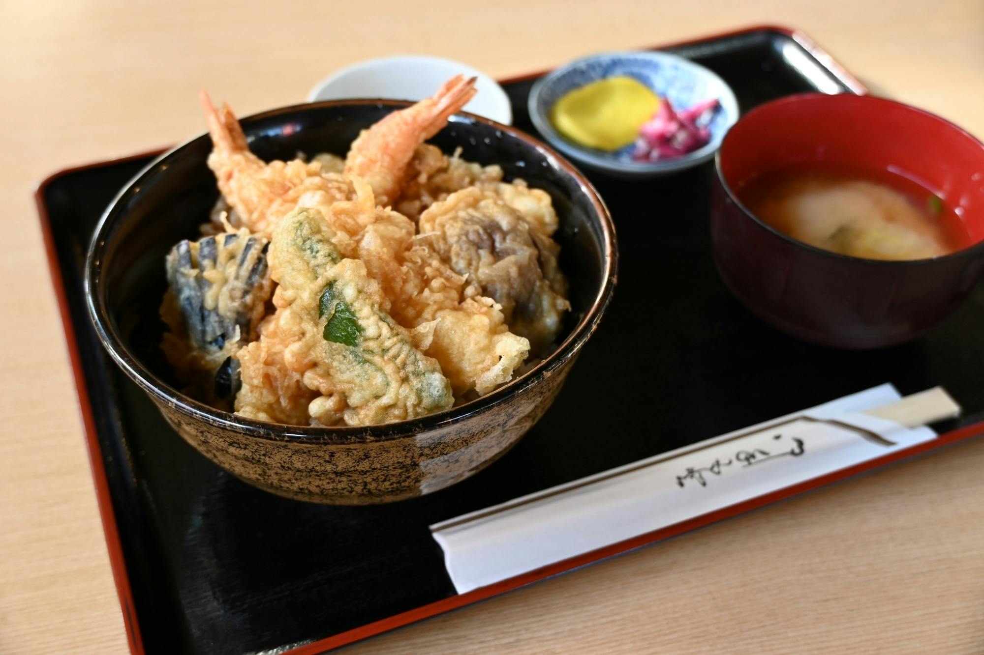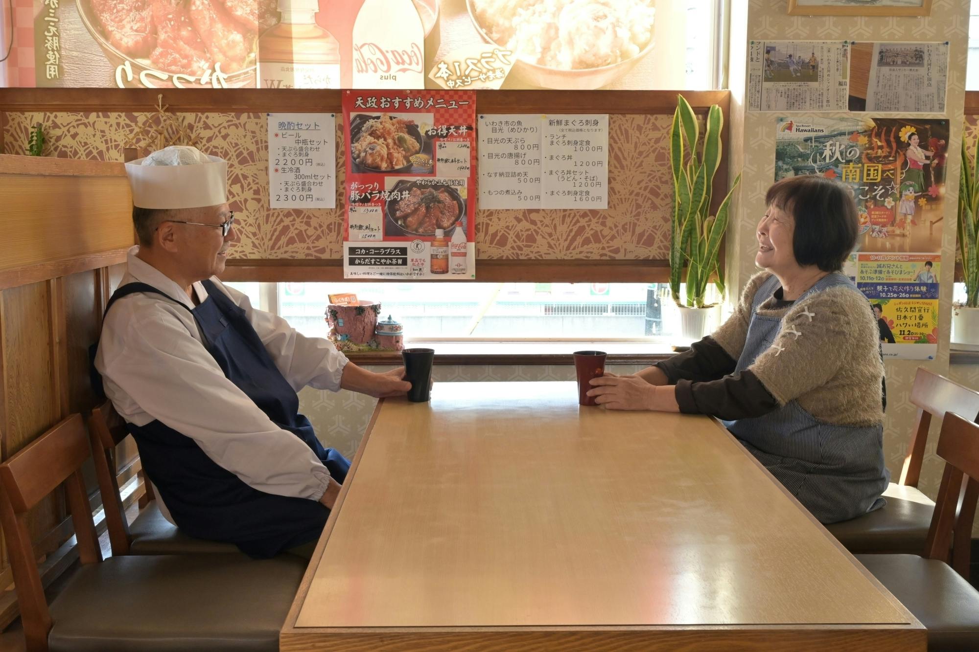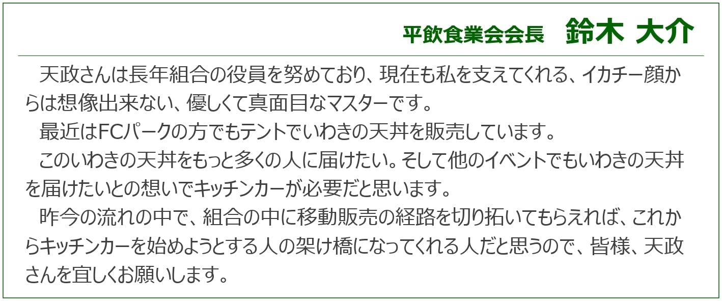 おかげさまで創業から35年、地域のみなさんに支えられながら、食堂として天丼をはじめとする味をお届けしてきました。現在は店舗での営業に加え、いわきFCのスタジアムグルメとしても出店し、いわきのサポーターさんはもちろん、アウェーのサポーターさんにも「いわき市の魚メヒカリ天ぷら入り天丼」として大変ご好評をいただいております。